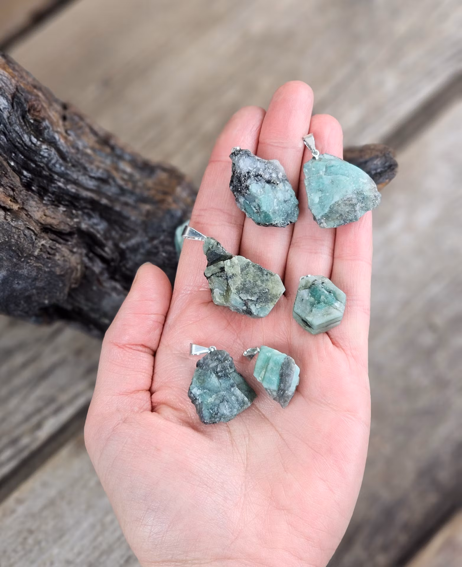 Vackert silverpläterat hänge med naturlig rå Smaragd. De varierar i utseende. Säljes styckvis. Du köper slumpvis liknande smycke enligt text & bild ovan. Tänk på att kristaller kommer från naturen & naturliga sprickor & ojämnhet kan förekomma. Färger kan skilja sig beroende på hur ljuset faller ner på produkten samt även mellan olika bildskärmar m.m.
