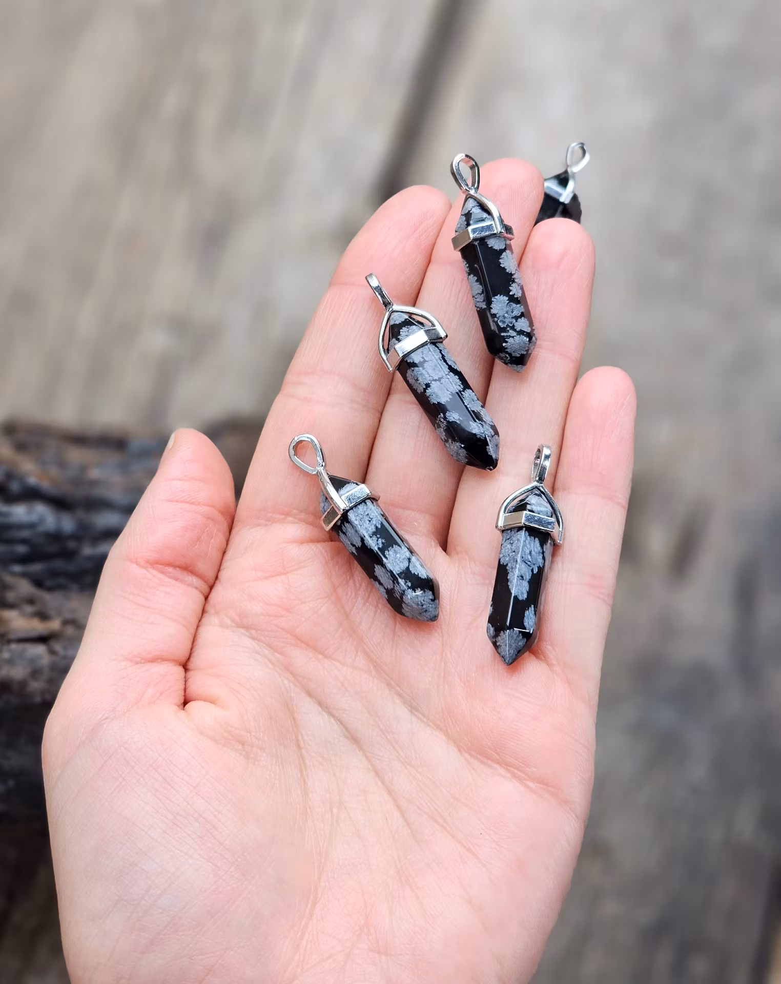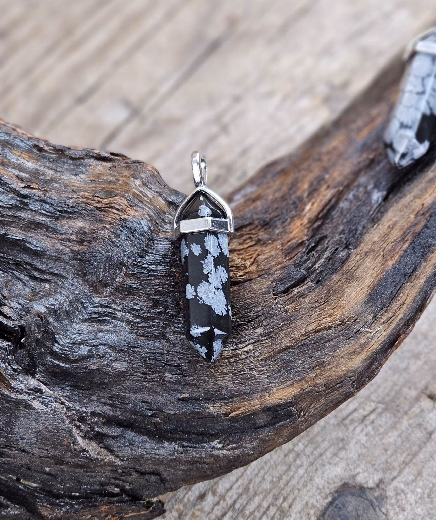 Snöflingeobsidian polerad spets, silverpläterat hänge