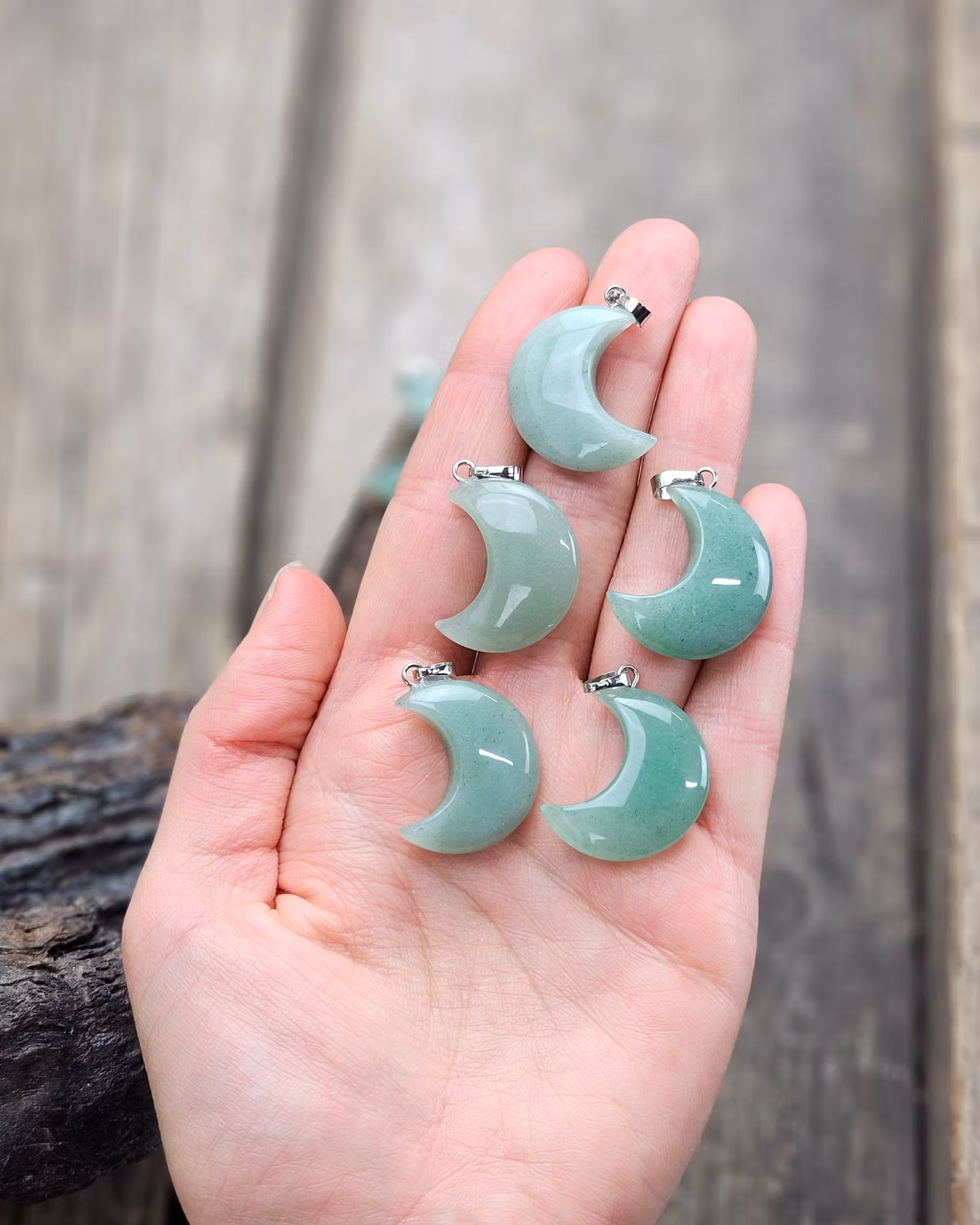 Vackert silverpläterat hänge med en stor fin måne i Grön Aventurin. De varierar i utseende. Säljes styckvis. Du köper ett slumpvis liknande smycke enligt text & bild ovan. Tänk på att kristaller kommer från naturen & naturliga sprickor & ojämnhet kan förekomma. Färger kan skilja sig beroende på hur ljuset faller ner på produkten samt även mellan olika bildskärmar m.m.