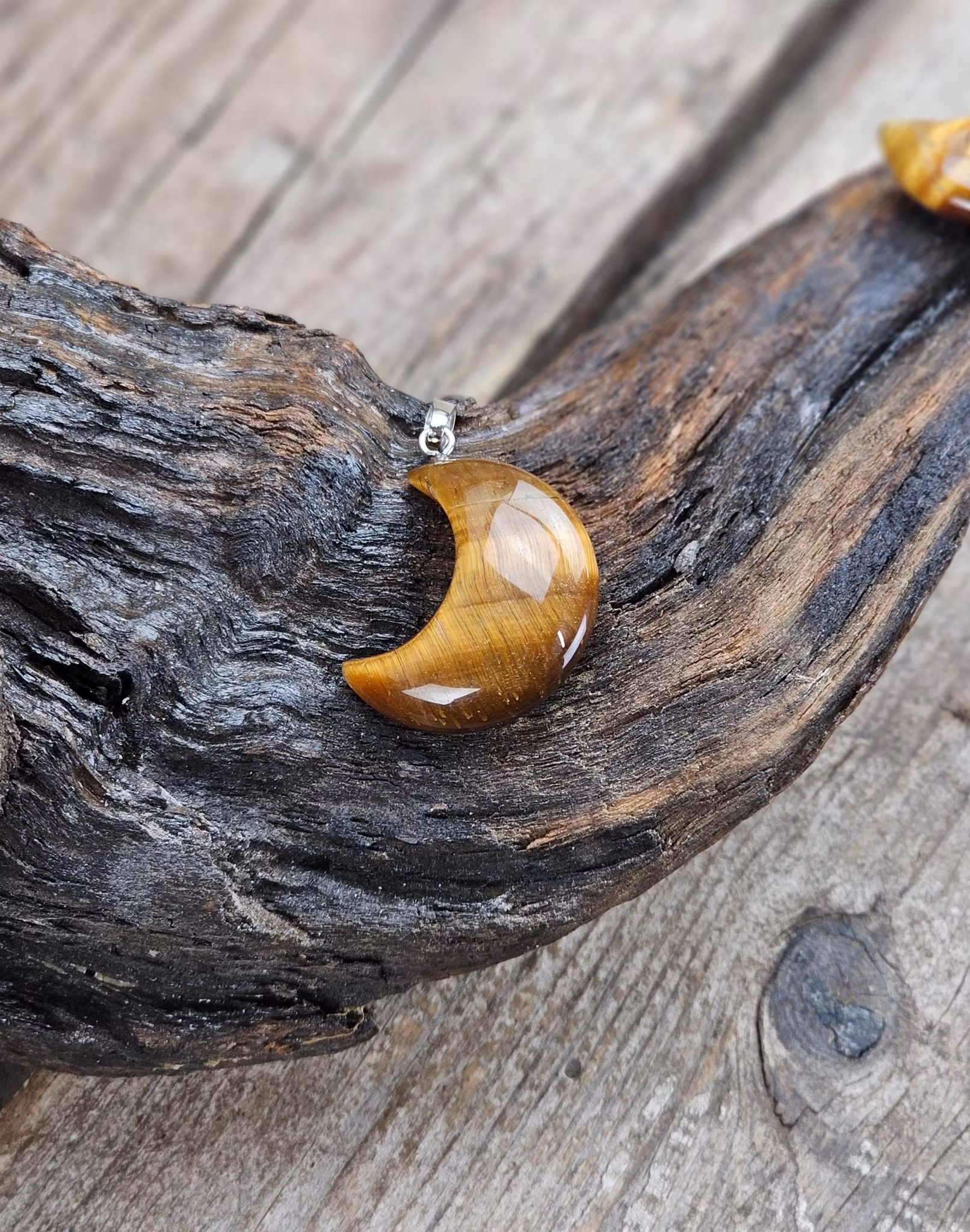 Vackert silverpläterat hänge med en stor fin måne i Tigeröga. De varierar i utseende. Säljes styckvis. Du köper ett slumpvis liknande smycke enligt text & bild ovan. Tänk på att kristaller kommer från naturen & naturliga sprickor & ojämnhet kan förekomma. Färger kan skilja sig beroende på hur ljuset faller ner på produkten samt även mellan olika bildskärmar m.m.