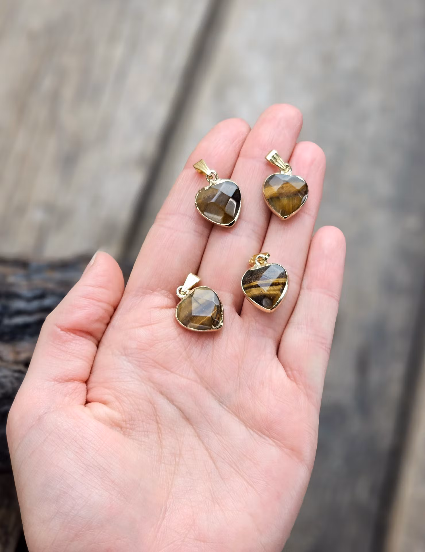 Mycket vackert guldpläterat hänge med ett nätt facetterat hjärta i Tigeröga. De varierar i utseende. Säljes styckvis. Du köper ett slumpvis liknande smycke enligt text & bild ovan. Tänk på att kristaller kommer från naturen & naturliga sprickor & ojämnheter kan förekomma. Färger kan skilja sig beroende på hur ljuset faller ner på produkten samt även mellan olika bildskärmar m.m.
