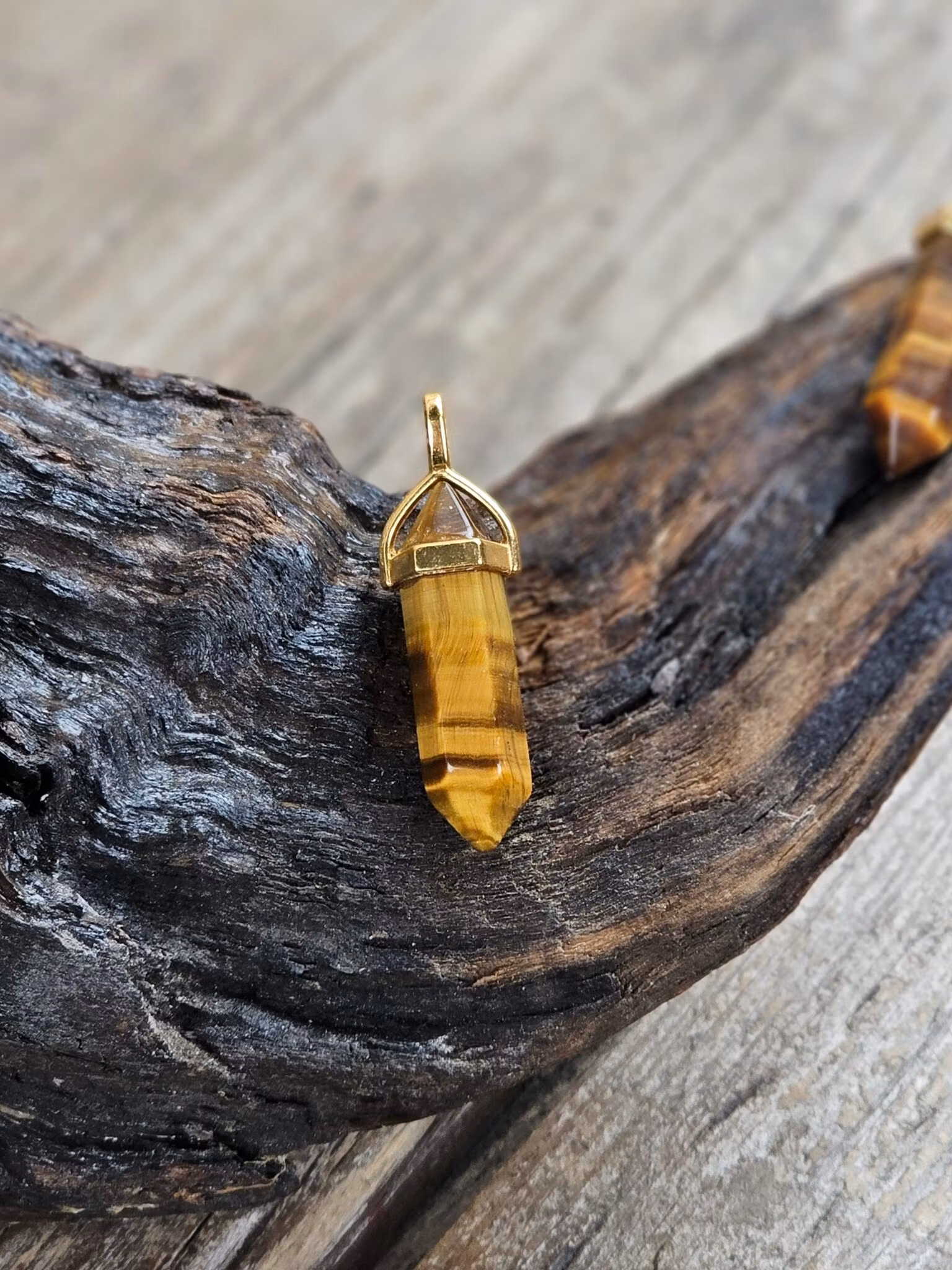 Så fint guldpläterat hänge med vacker polerad spets i Tigeröga. De varierar i utseende. Säljes styckvis. Du köper ett slumpvis liknande smycke enligt text & bild ovan. Tänk på att kristaller kommer från naturen & naturliga sprickor & ojämnhet kan förekomma. Färger kan skilja sig beroende på hur ljuset faller ner på produkten samt även mellan olika bildskärmar m.m.