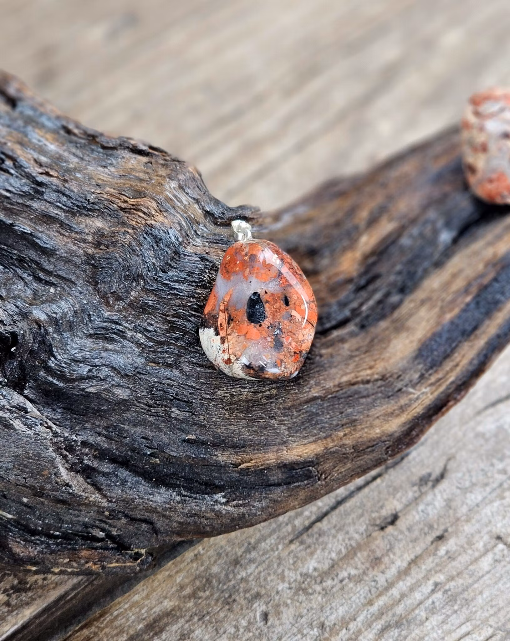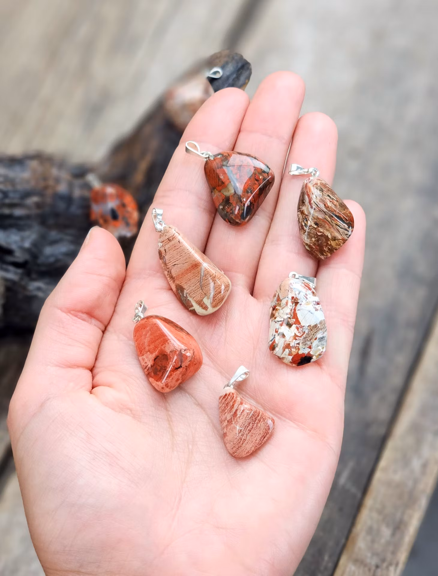 Vackert silverpläterat hänge med trumlad Breccijaspis. De varierar i utseende och form. Säljes styckvis. Kedja ingår ej. Du köper ett smycke enligt text & bild. Tänk på att kristaller kommer från naturen, små skillnader kan därför förekomma i produktens utseende på grund av dess naturmaterial. Färger kan skilja sig beroende på hur ljuset faller ner på produkten samt även mellan olika bildskärmar m.m.