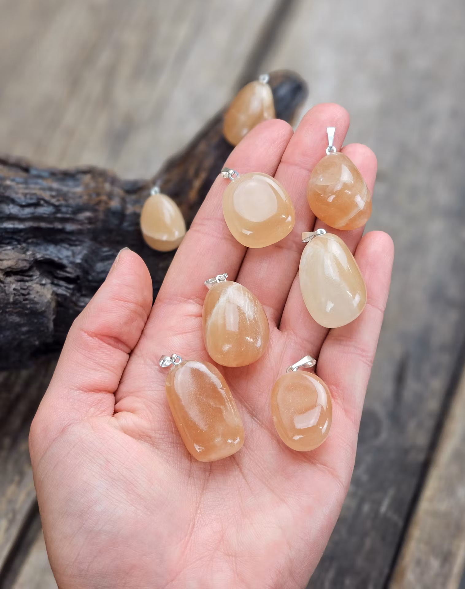 Vackert silverpläterat hänge med trumlad Honungsaragonit. De varierar i utseende och form. Säljes styckvis. Kedja ingår ej. Du köper ett smycke enligt text & bild. Tänk på att kristaller kommer från naturen, små skillnader kan därför förekomma i produktens utseende på grund av dess naturmaterial. Färger kan skilja sig beroende på hur ljuset faller ner på produkten samt även mellan olika bildskärmar m.m.