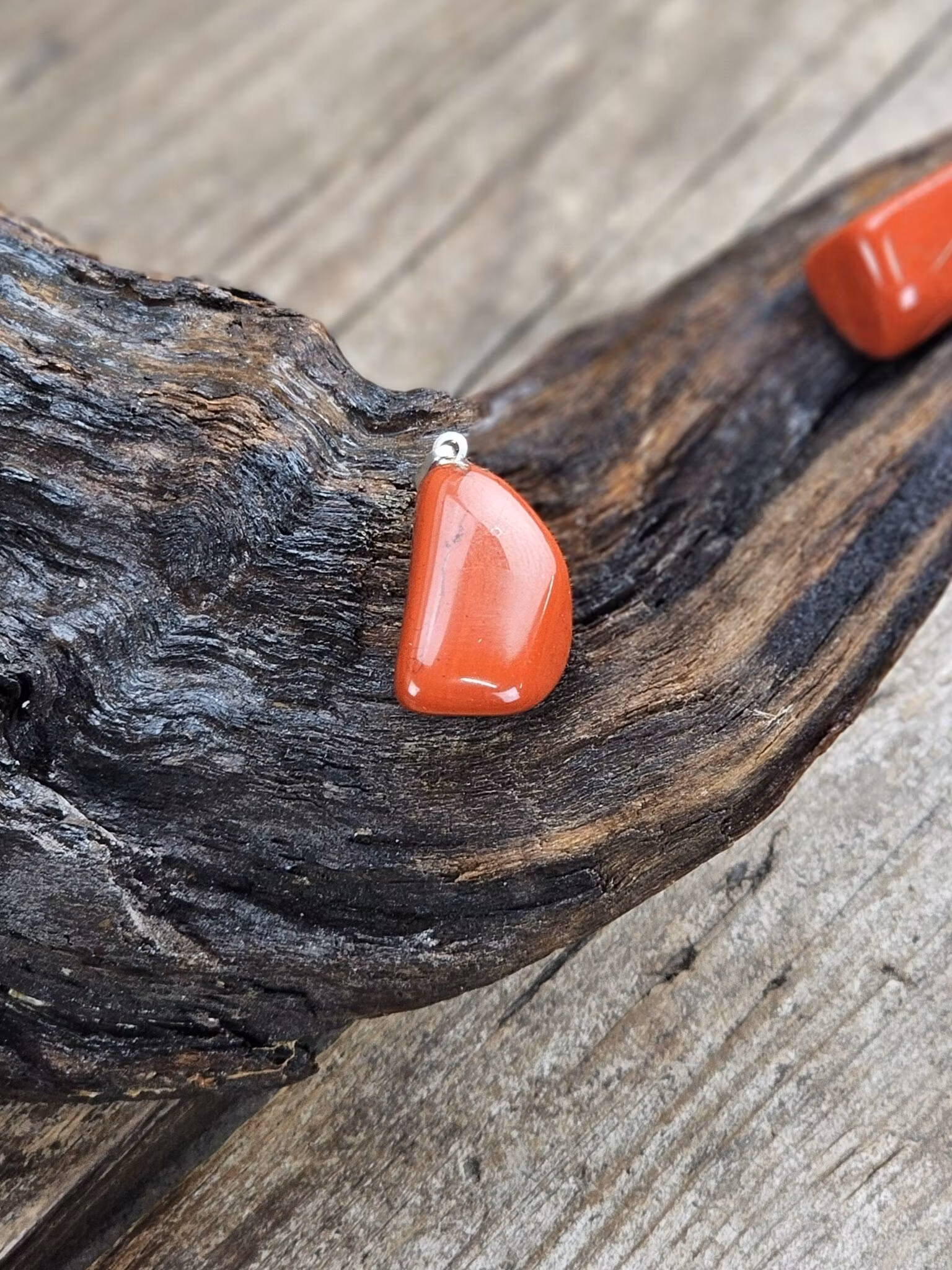 Vackert silverpläterat hänge med trumlad Röd Jaspis. De varierar i utseende och form. Säljes styckvis. Kedja ingår ej. Du köper ett smycke enligt text & bild. Tänk på att kristaller kommer från naturen, små skillnader kan därför förekomma i produktens utseende på grund av dess naturmaterial. Färger kan skilja sig beroende på hur ljuset faller ner på produkten samt även mellan olika bildskärmar m.m.