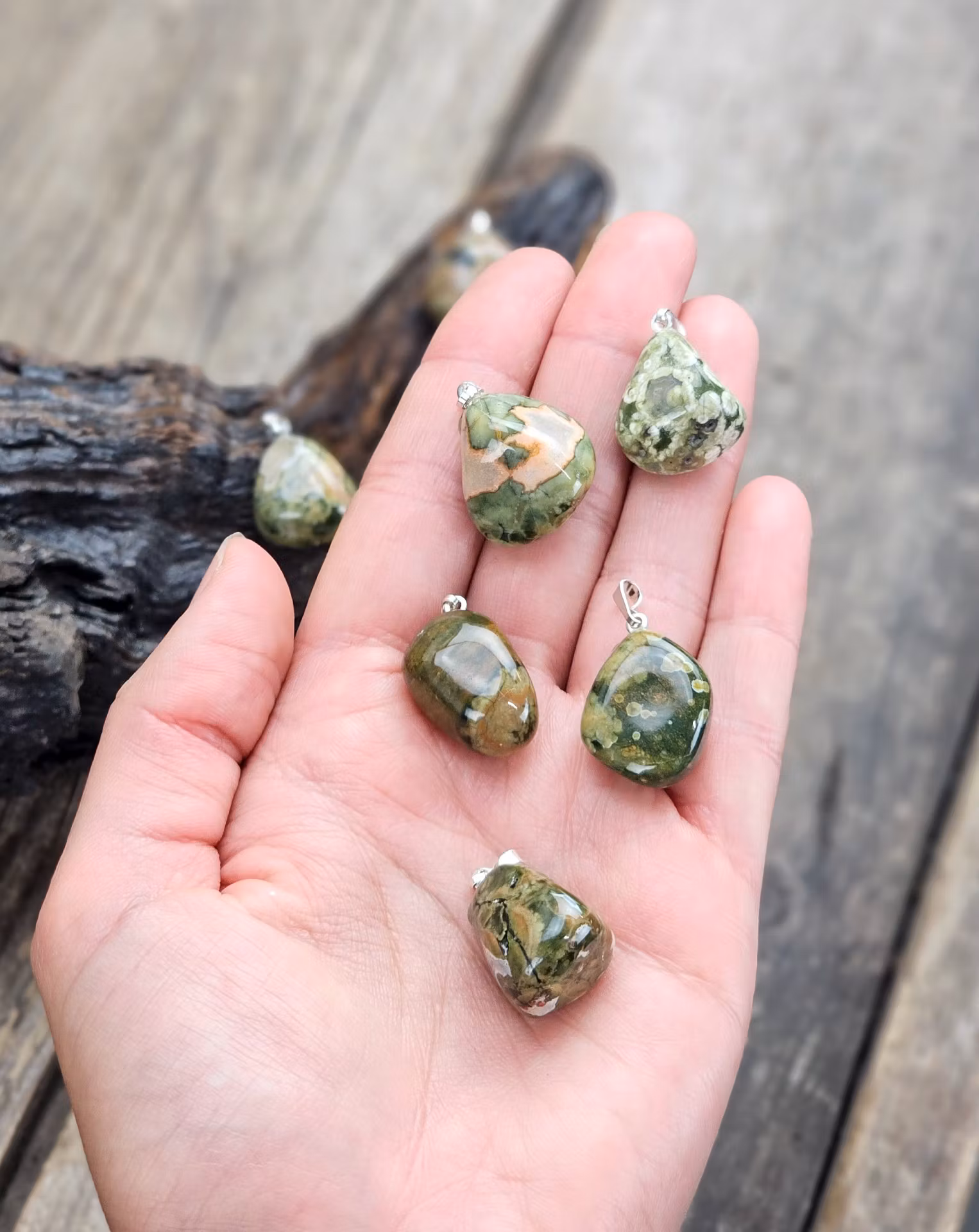 Vackert silverpläterat hänge med trumlad Ryolit. De varierar i utseende och form. Säljes styckvis. Kedja ingår ej. Du köper ett smycke enligt text & bild. Tänk på att kristaller kommer från naturen, små skillnader kan därför förekomma i produktens utseende på grund av dess naturmaterial. Färger kan skilja sig beroende på hur ljuset faller ner på produkten samt även mellan olika bildskärmar m.m.