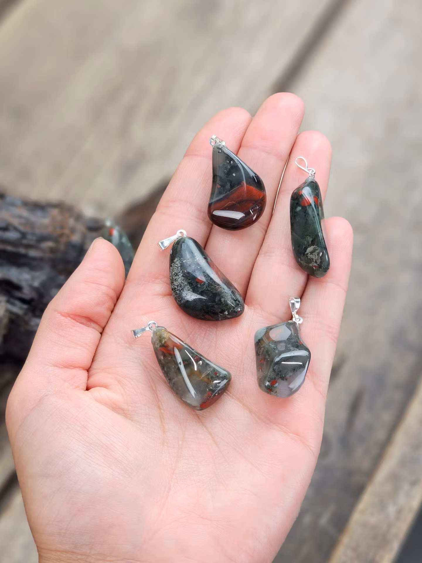 Vackert silverpläterat hänge med trumlad Vulkanjaspis. Denna sten går under flera namn, däribland Afrikansk Blodsten eller Seftonit. Den har olika härliga grågröna nyanser med röda stänk i eller röda partier. De varierar i utseende och form. Säljes styckvis. Kedja ingår ej. Du köper ett smycke enligt text & bild. Tänk på att kristaller kommer från naturen, små skillnader kan därför förekomma i produktens utseende på grund av dess naturmaterial. Färger kan skilja sig beroende på hur ljuset faller ner på produkten samt även mellan olika bildskärmar m.m.