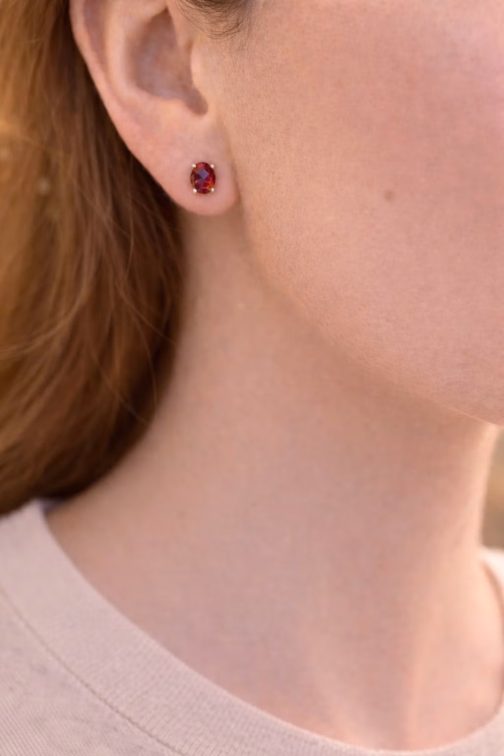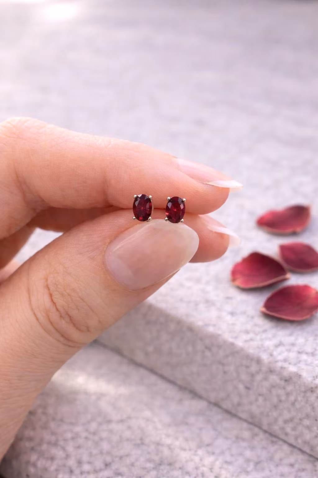 Eleganta örhängen med facettslipad Granat i en djup vinröd ton. Den ovala stenen reflekterar ljuset genom sina facetter och skapar ett subtilt skimmer som framhäver kristallens naturliga färg. Den mörkt röda nyansen ger smycket ett elegant och tidlöst uttryck. Säljs i par.
