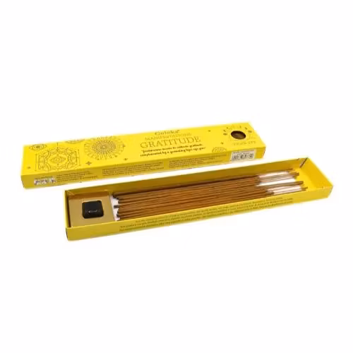 Goloka Manifestation Gratitude – en upplyftande rökelse med doft av Frankincense som väcker tacksamhet, lugn och beskydd. Varje ask innehåller naturliga rökelsepinnar tillsammans med en trumlad Tigeröga. Perfekt för meditation, reflektion och stunder av inre balans. Säljs per förpackning (ca 10–12 rökelsepinnar + 1 Tigeröga).