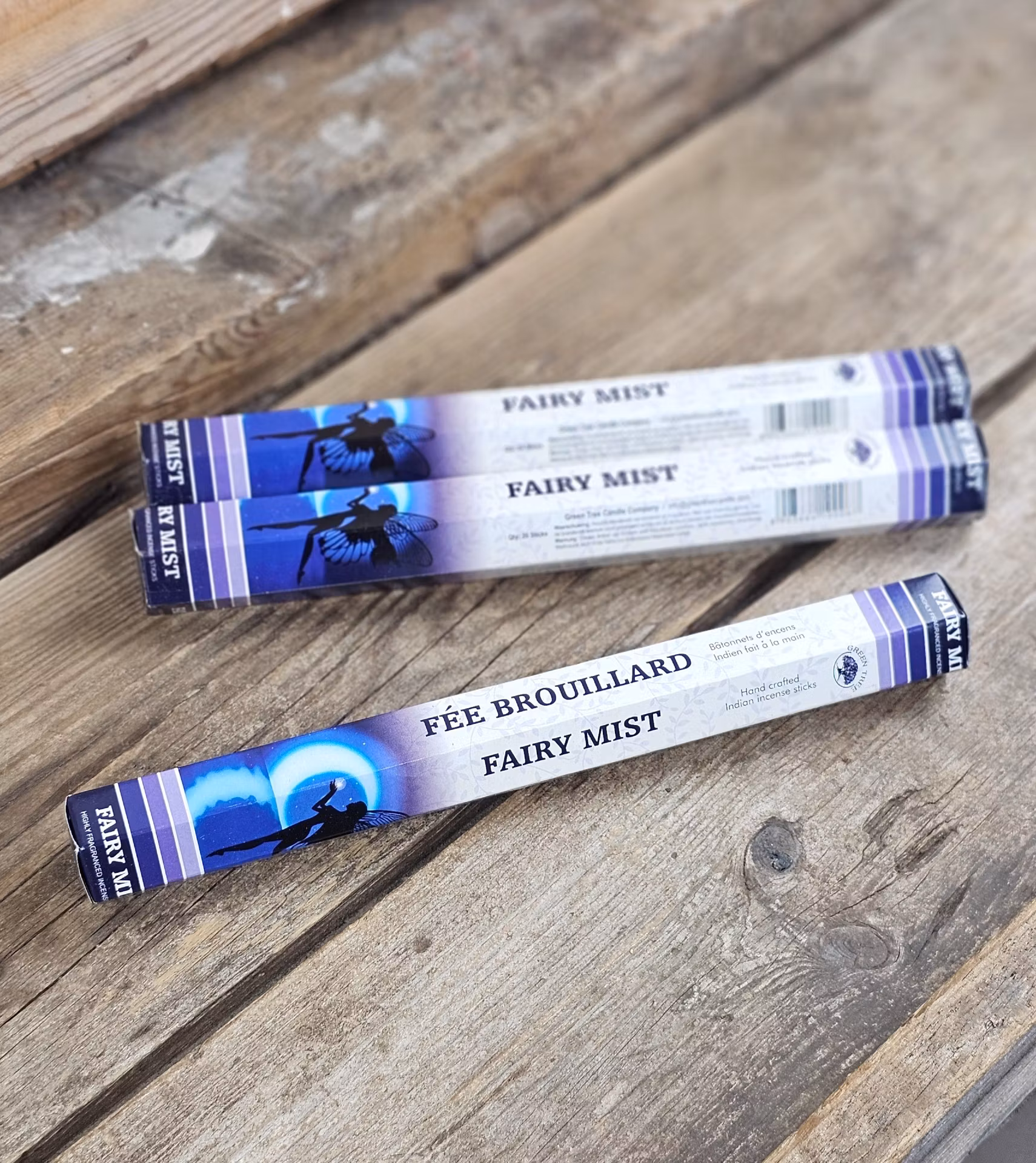 Doft: Fairy Mist. Fairy Mist får ditt hus att lukta som om du besöktes av en värld av magi som har lämnat älvstoft efter sig. Det kan beskrivas som en fräsch och mystisk doft. Handgjord rökelseblandning som kombinerar aromatiska örter, hartser och eteriska oljor, vilket skapar en fängslande doft som främjar avkoppling och positiv energi. Masala rökelse, som kommer från Indien, skapas genom att blanda naturliga ingredienser för att bilda en pasta, vilket resulterar i en längre hållbar och rikare arom som förstärker din meditation och andliga övningar.