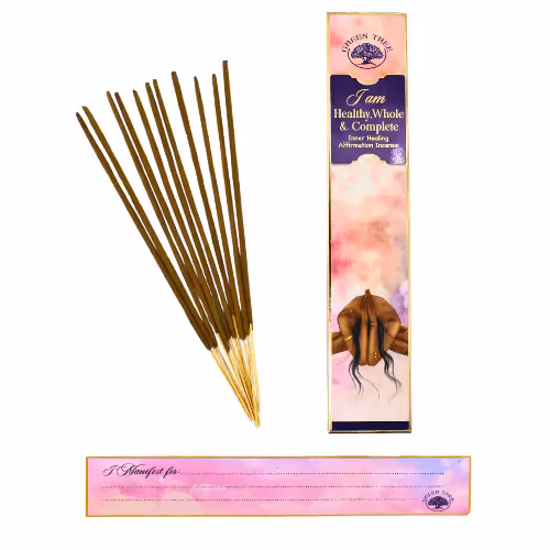Doft: I am Healthy, Whole & Complete. Upplev kraften i manifestationen med dessa rökelsepinnar infunderade med den kraftfulla bekräftelsen "I Am Healthy, Whole & Complete". Denna rökelse kommer att ge positiv energi och manifestation i ditt liv. Njut av ett hälsosamt, helt och komplett sinne, kropp och själ vid varje användning. Du är frisk, hel och komplett och kapabel att släppa saker. Denna rökelse skapar en energisk kanal för dina affirmationer. Använd den för att manifestera dina drömmar. Handgjorda rökelser med ingredienser av högsta kvalitet som är cruelty free och miljövänliga.