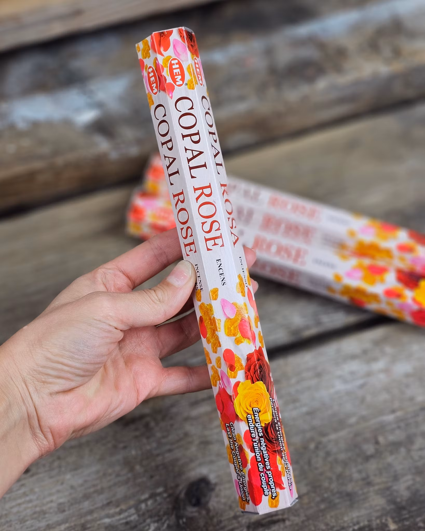 HEM Copal Rose rökelse kombinerar den jordnära värmen från Copal med den mjuka, söta doften av rosor. Resultatet är en ljuvlig och romantisk doftupplevelse som skapar en känsla av kärlek, lugn och välmående. Den passar utmärkt vid avslappning, meditation eller för att sprida en varm och välkomnande atmosfär i hemmet. En perfekt balans mellan jordnära trygghet och blommande skönhet.