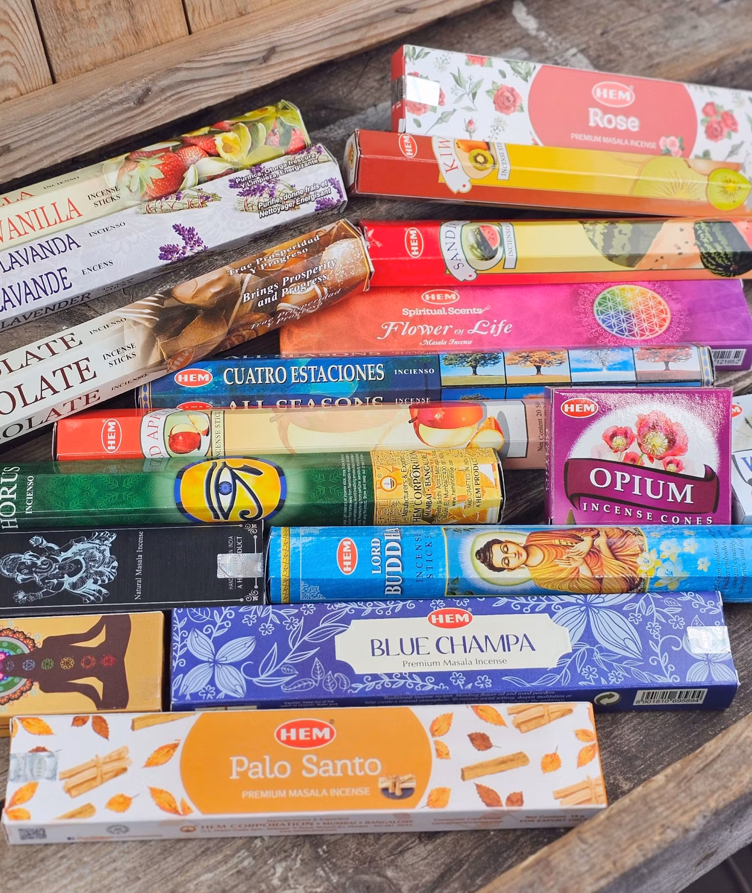 Säljes per 9 stycken slumpvis utvalda paket rökelser av blandad modell pinnar/koner utan backflow från märket HEM.