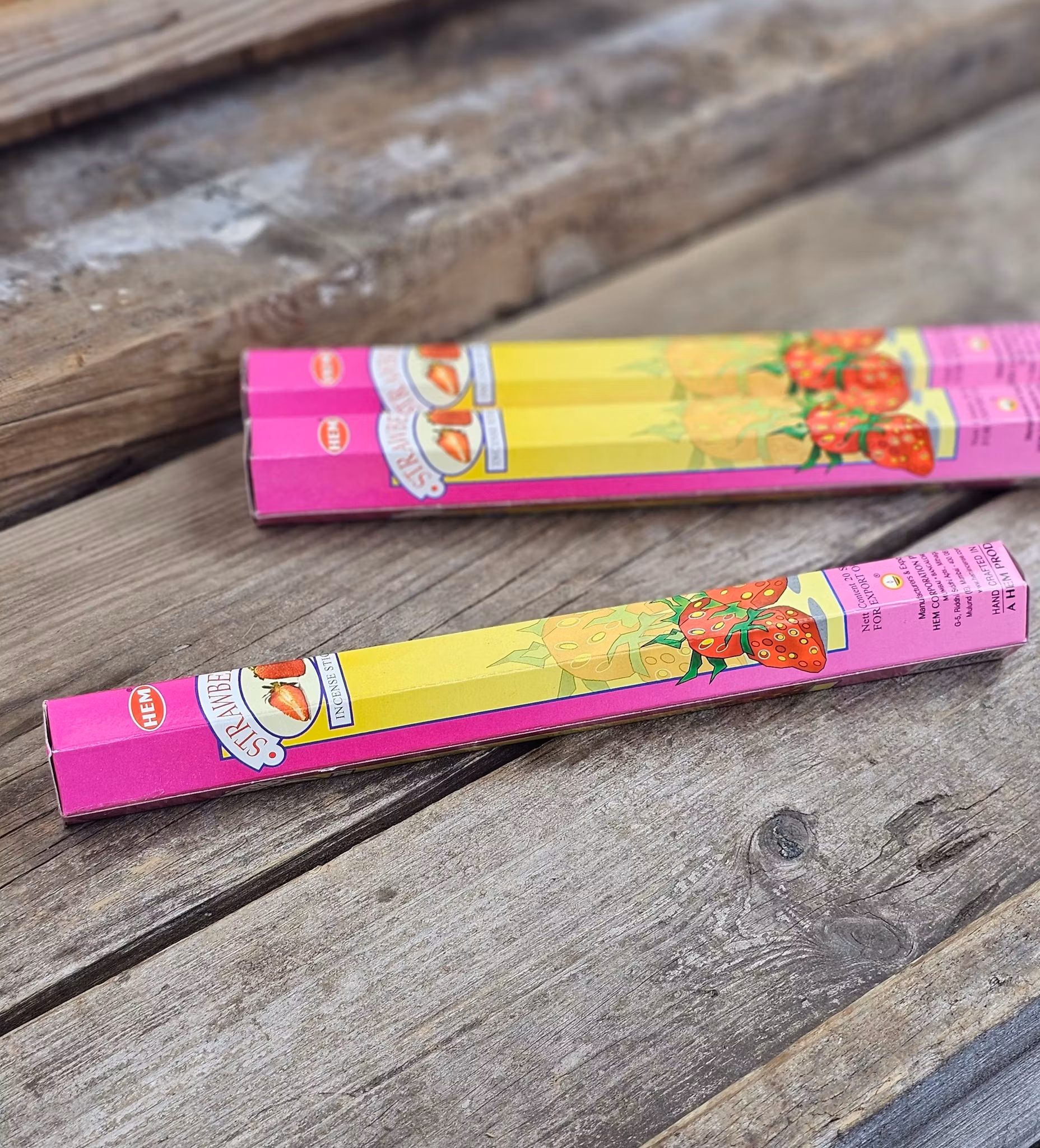 HEM Strawberry – fräsch, söt och fruktig doft av jordgubbar. Vegansk och cruelty free. Perfekt för glädje, energi och somrig harmoni. Säljs per förpackning (ca 20 pinnar).