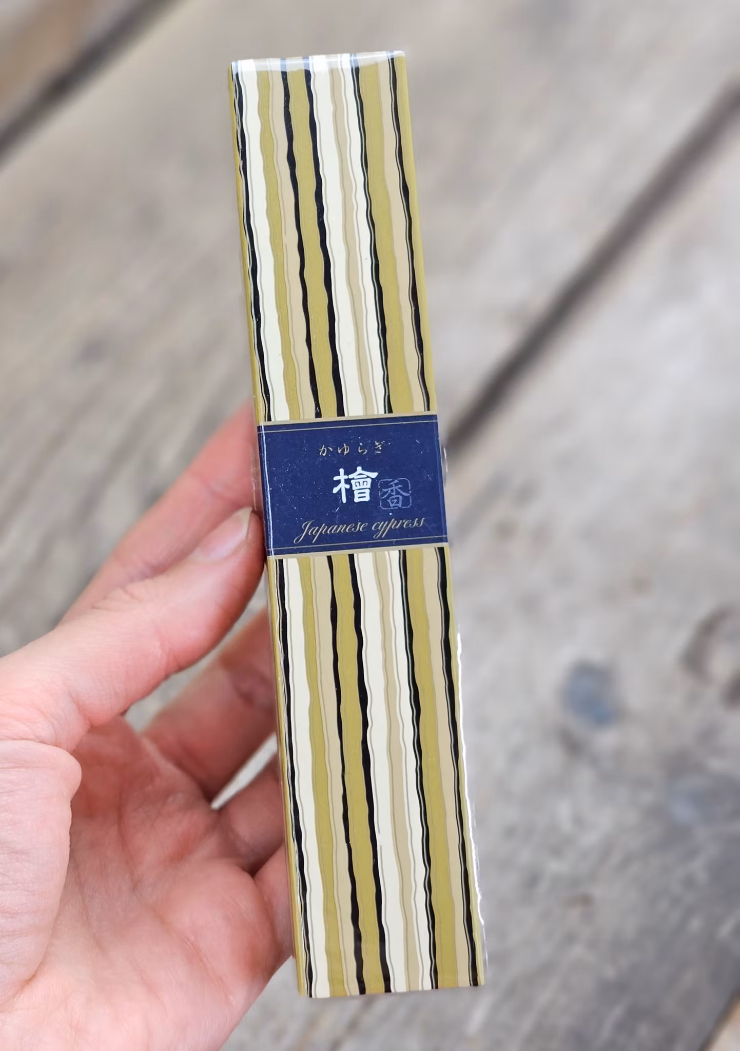 Doft: Hinoki Japanese Cypress. Fräsch och lugnande doft av japansk cypress. Den torra och uppiggande doften av hinoki stimulerar tänkandet och klargör sinnet eftersom det ökar koncentrationen och upplösningen. Det sägs också ha antibakteriella effekter. Det kommer säkert att dröja kvar i ditt hjärta! En lyxig rökelse med lyxig förpackning, för värdefulla stunder.