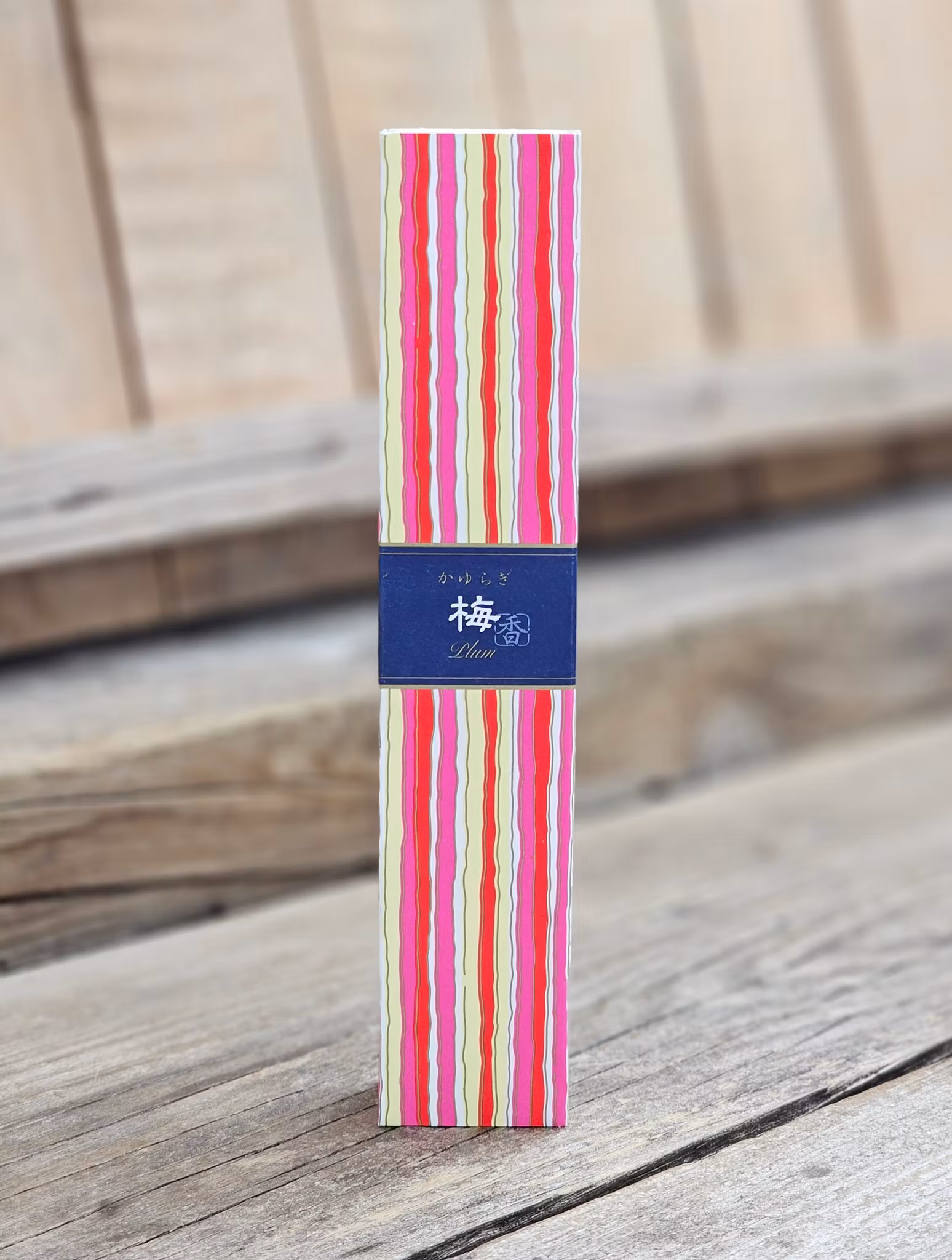 Doft: Plum. Blommig och glad doft av plommon. I Japan symboliserar plommonträd återfödelse eftersom deras tidiga blomning tillkännager vårens ankomst. En lyxig rökelse med lyxig förpackning, för värdefulla stunder.