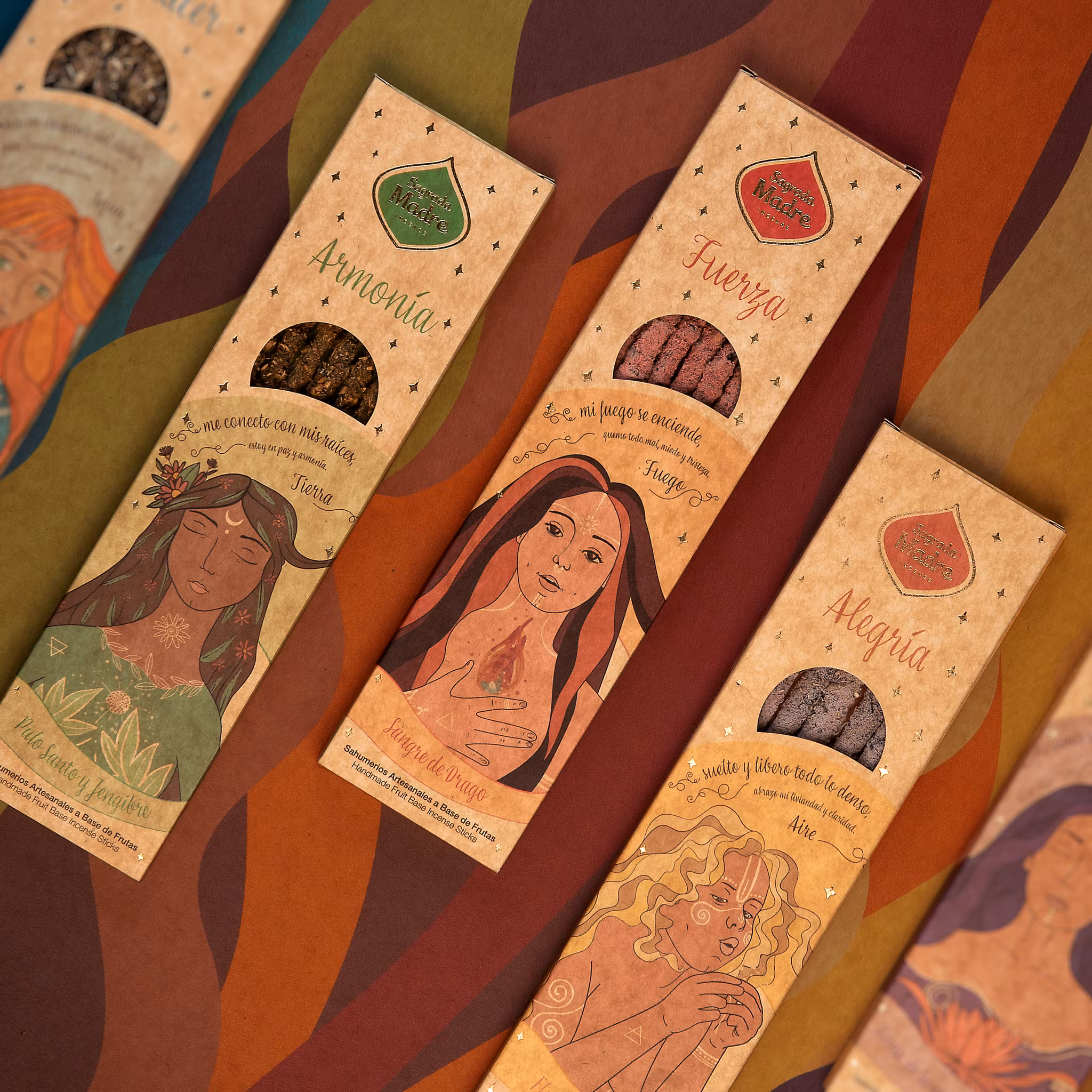 Märke: Sagrada Madre. Sagrada Madre betyder "Helig Moder" (Pancha Mama) och detta namn speglar hur de behandlar jordens resurser. Det är ett märke med väldoftande och högkvalitativa rökelser som tillverkas i Argentina. Förutom träkol använder Sagrada Madre en doftfri fruktbaserad biomassa som förbränningsmedel. Varje år slängs över 100 ton fruktbiomassa från industriell bearbetning såsom juicetillverkning. Istället för att låta dessa material gå till spillo, återanvänder Sagrada Madre dem effektivt i deras rökelser. En 100% unik naturprodukt, handgjord i Argentina av pulveriserade örter, hartser (kåda) och blommor, ihop med ett växtbaserat bindemedel. Alla varianter av Sagrada Madre rökelse är noggrant förpackade i attraktivt naturligt förpackningsmaterial för att skapa så liten påverkan på miljön som möjligt.