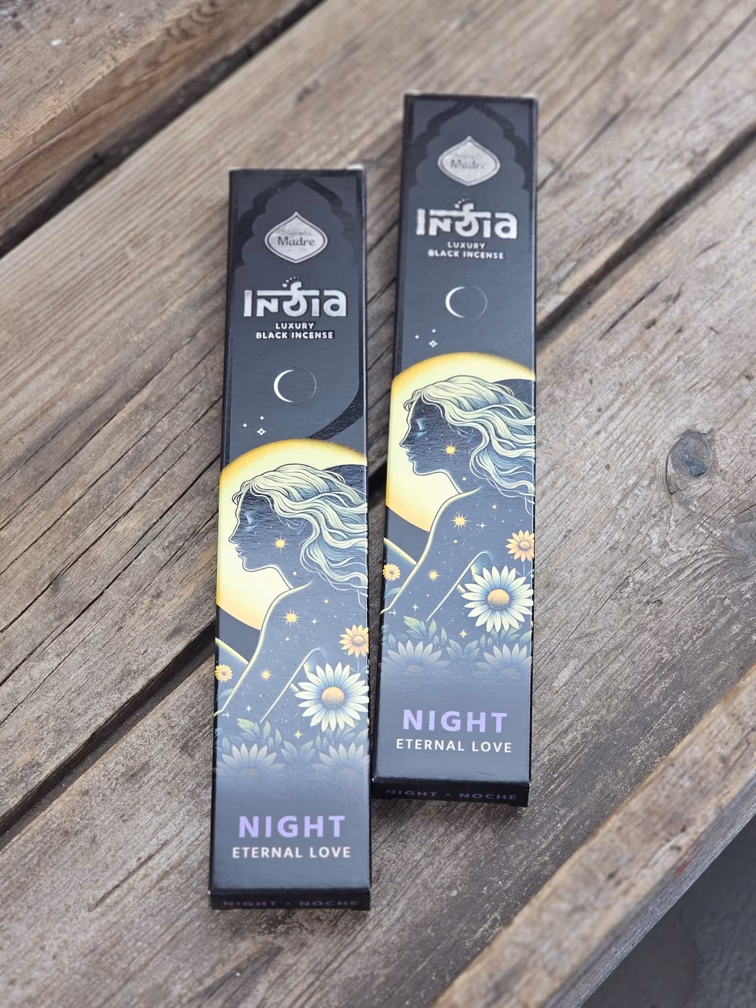 Doft: Night. (Natt) Evig kärlek. I natten härskar mörkret, av tystnad och frid, där stjärnorna viskar, på en mörk himmel. Varje stjärna är en önskan, i det vidsträckta Eden, natten väver berättelser, om kärlek. Den mystiska kombinationen av dofter i denna förföriska rökelse vibrerar av lust och ler mot kärleken. Sammansättning: Träkol, indiskt träpulver, eteriska oljor, koncentrerade aromatiska oljor, naturligt bindemedel, bambustav. 100% vegansk, ekologisk.