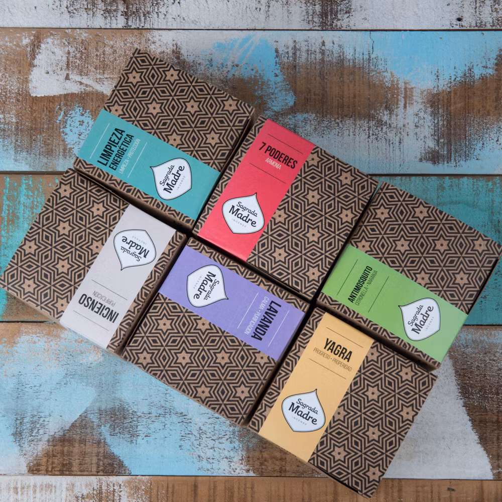 Märke: Sagrada Madre. Sagrada Madre betyder "Helig Moder" (Pancha Mama) och detta namn speglar hur de behandlar jordens resurser. Det är ett märke med väldoftande och högkvalitativa rökelser som tillverkas i Argentina. Förutom träkol använder Sagrada Madre en doftfri fruktbaserad biomassa som förbränningsmedel. Varje år slängs över 100 ton fruktbiomassa från industriell bearbetning såsom juicetillverkning. Istället för att låta dessa material gå till spillo, återanvänder Sagrada Madre dem effektivt i deras rökelser. En 100% unik naturprodukt, handgjord i Argentina av pulveriserade örter, hartser (kåda) och blommor, ihop med ett växtbaserat bindemedel. Alla varianter av Sagrada Madre rökelse är noggrant förpackade i attraktivt naturligt förpackningsmaterial för att skapa så liten påverkan på miljön som möjligt.