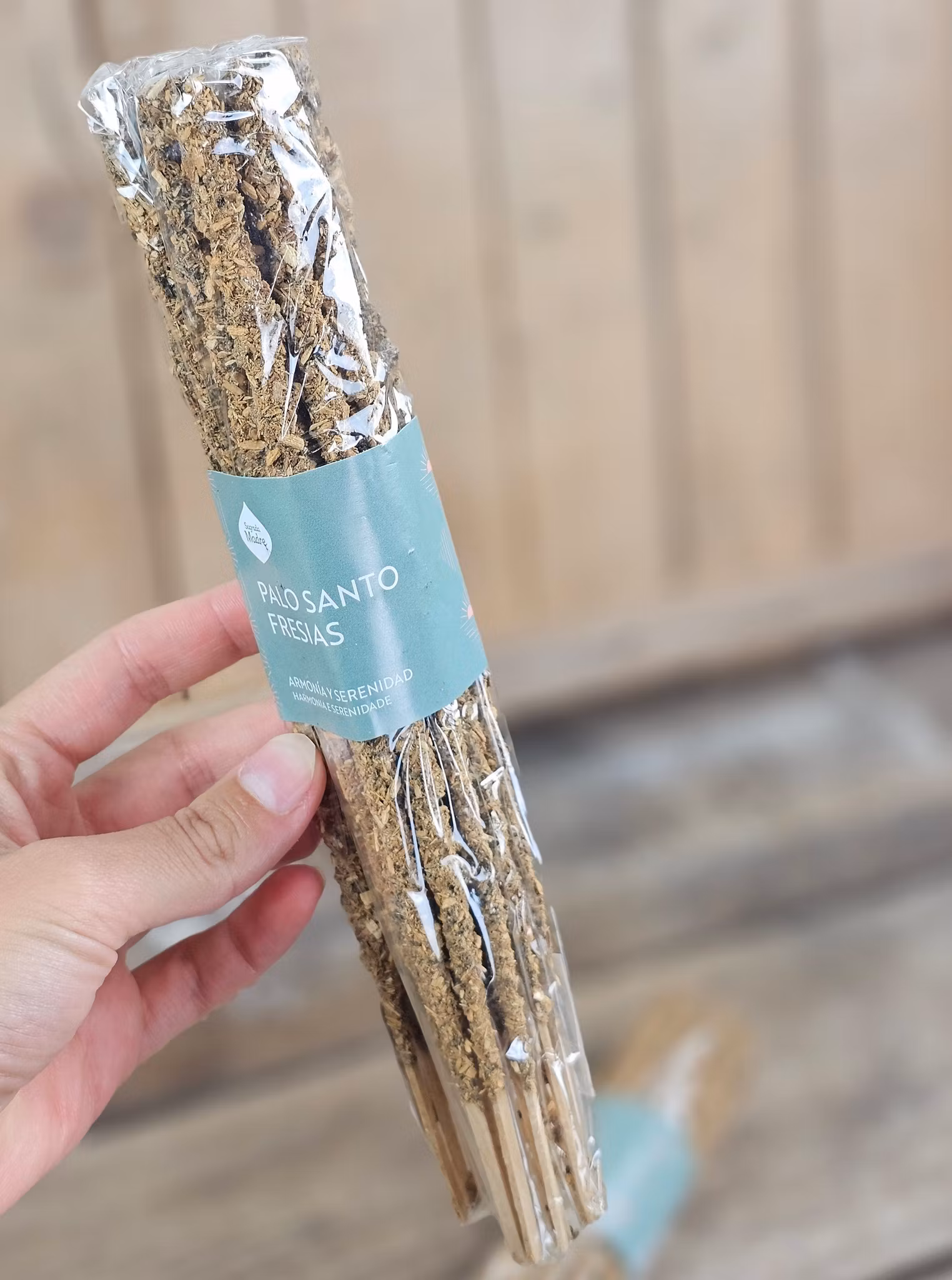 Doft: Palo Santo & Fresias. Tillverkad av en fantastisk kombo av Palo Santo och Fresias som tillsammans ger en fräsch och söt doft av trä, citrus ihop med en blommig uppfriskande doft. Med kraften från Palo Santo och fresias sötma inbjuder denna rökelse dig till att ansluta till det gudomliga och känna universums kärleksfulla närvaro. Tänd den och låt dess heliga rök omsluta dig, rena ditt sinne och lyfta din ande till en högre dimension. Inom aromaterapi förknippas Fresia oftast med att främja avslappning och minska stress på grund av dess lugnande blomdoft, vilket gör det till ett populärt val för lugnande och upplyftande miljöer. Dessutom tros dess arom ha humörhöjande egenskaper, som hjälper till att lindra känslor av ångest och spänning. En rökelse för romantik, glädje, avslappning och rening. Palo Santo doftar av härlig fräsch söt citrus, trä och tall. Sammansättning: Palo Santo-trä (Peru), koncentrerad aromatisk olja, träkol, fruktbiomassa, naturligt bindemedel och salt. 100% vegansk, ekologisk.