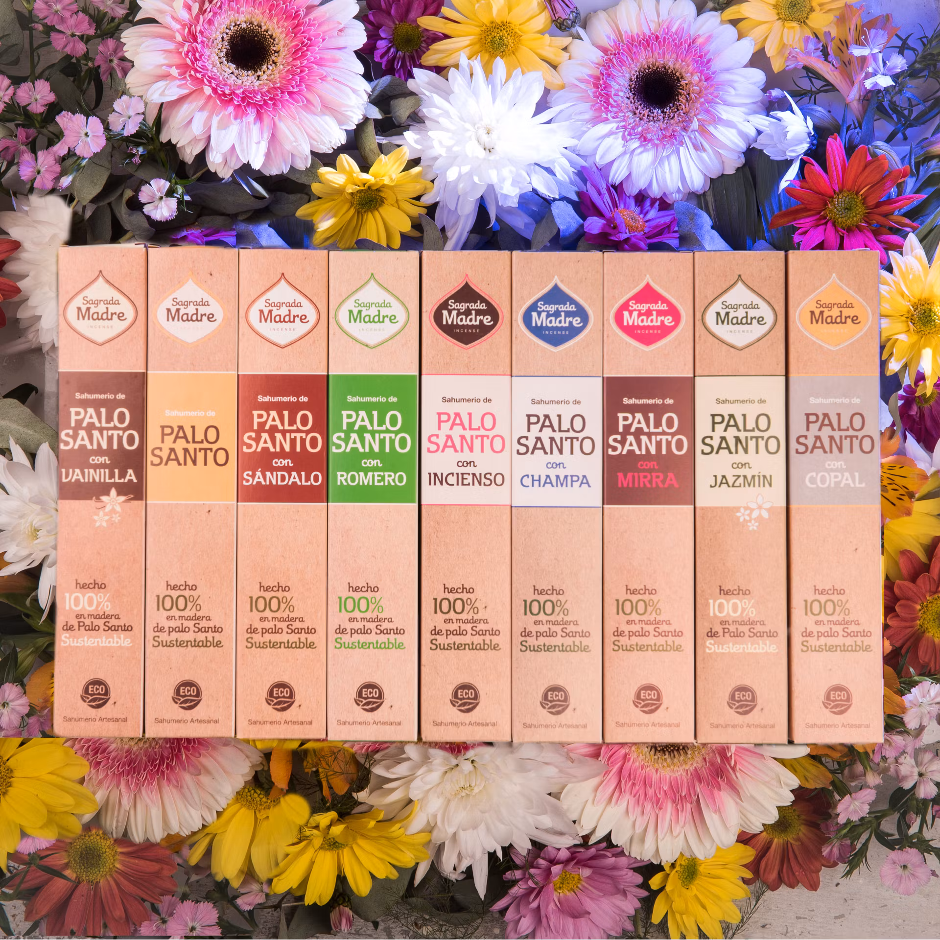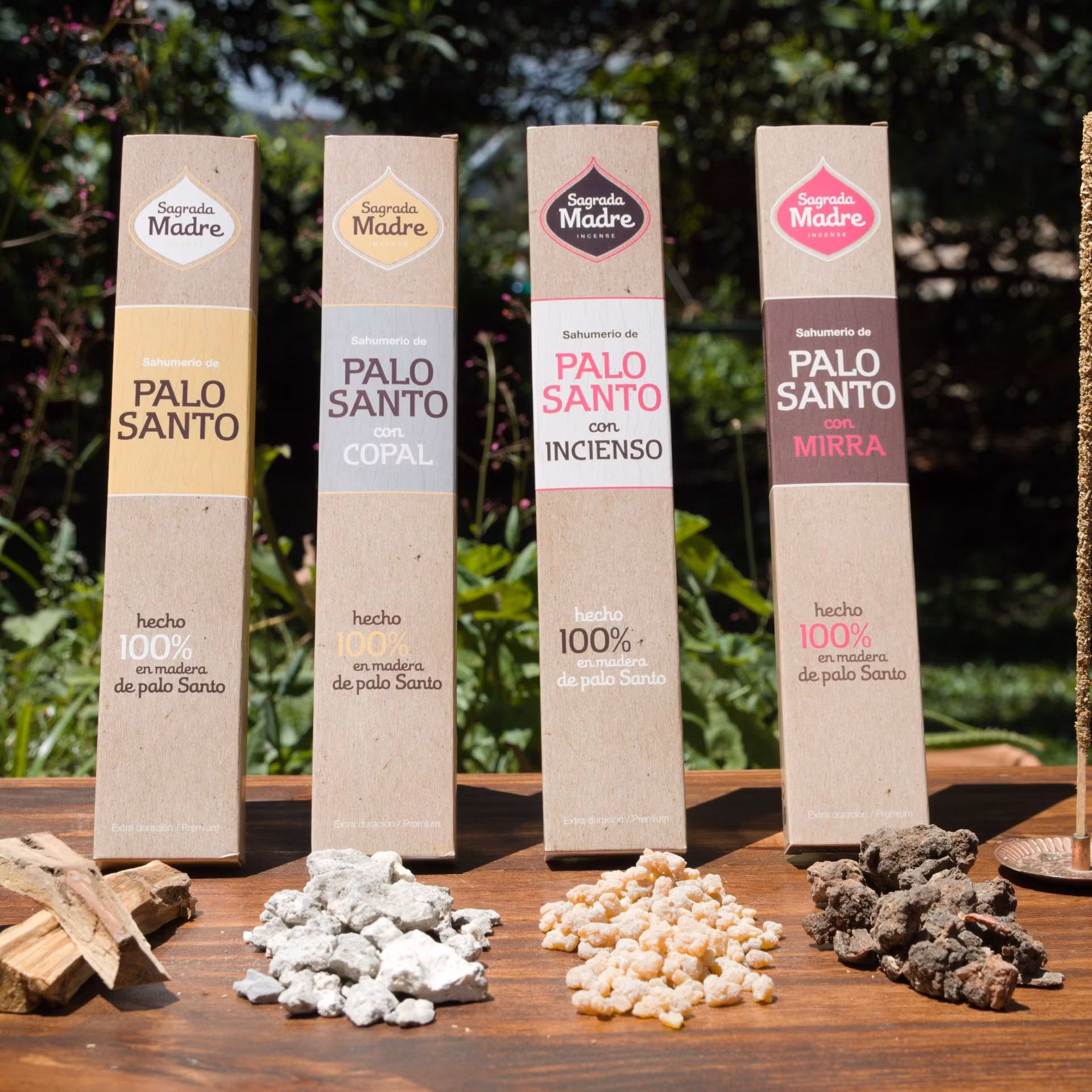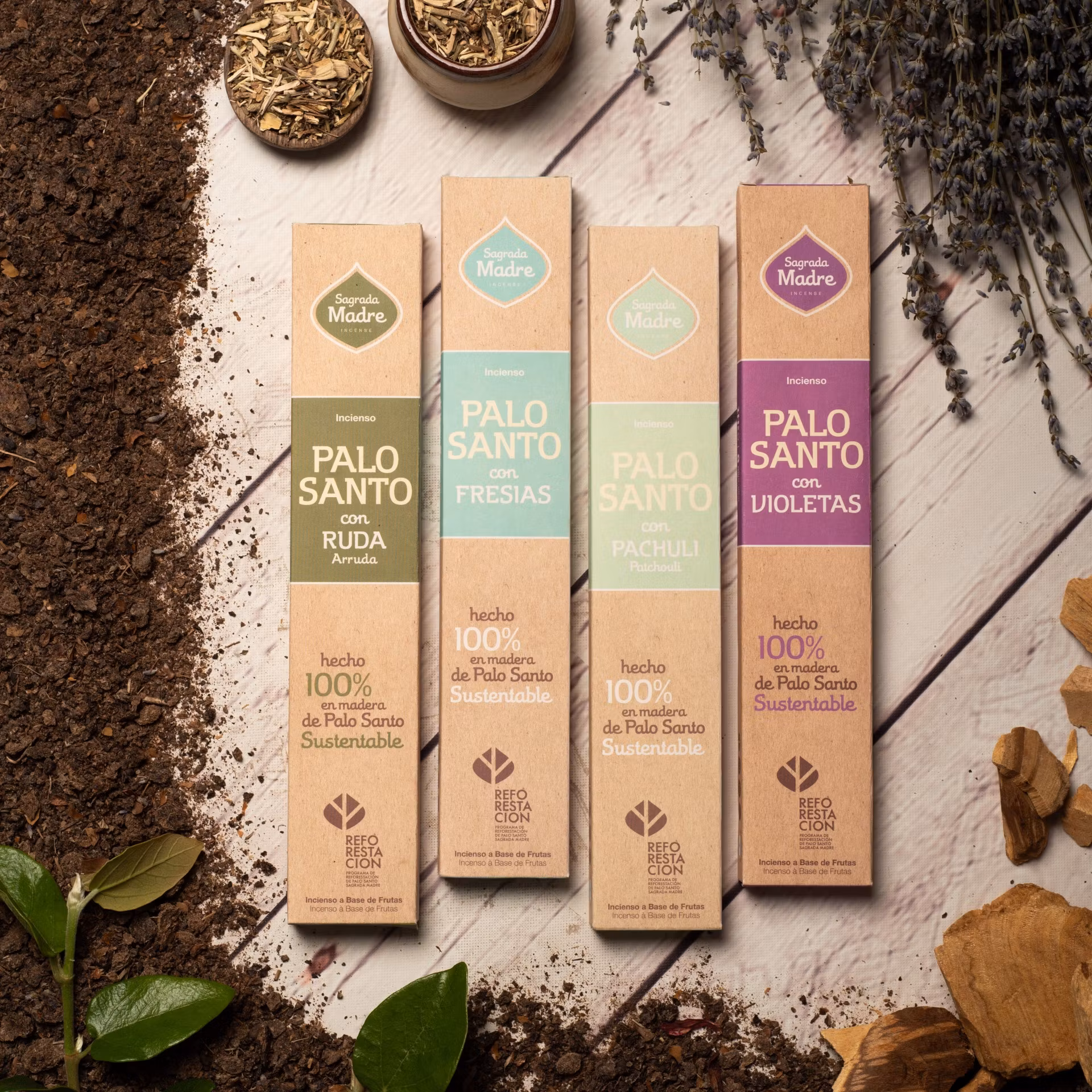 Märke: Sagrada Madre. Sagrada Madre betyder "Helig Moder" (Pancha Mama) och detta namn speglar hur de behandlar jordens resurser. Det är ett märke med väldoftande och högkvalitativa rökelser som tillverkas i Argentina. Förutom träkol använder Sagrada Madre en doftfri fruktbaserad biomassa som förbränningsmedel. Varje år slängs över 100 ton fruktbiomassa från industriell bearbetning såsom juicetillverkning. Istället för att låta dessa material gå till spillo, återanvänder Sagrada Madre dem effektivt i deras rökelser. En 100% unik naturprodukt, handgjord i Argentina av pulveriserade örter, hartser (kåda) och blommor, ihop med ett växtbaserat bindemedel. Alla varianter av Sagrada Madre rökelse är noggrant förpackade i attraktivt naturligt förpackningsmaterial för att skapa så liten påverkan på miljön som möjligt.