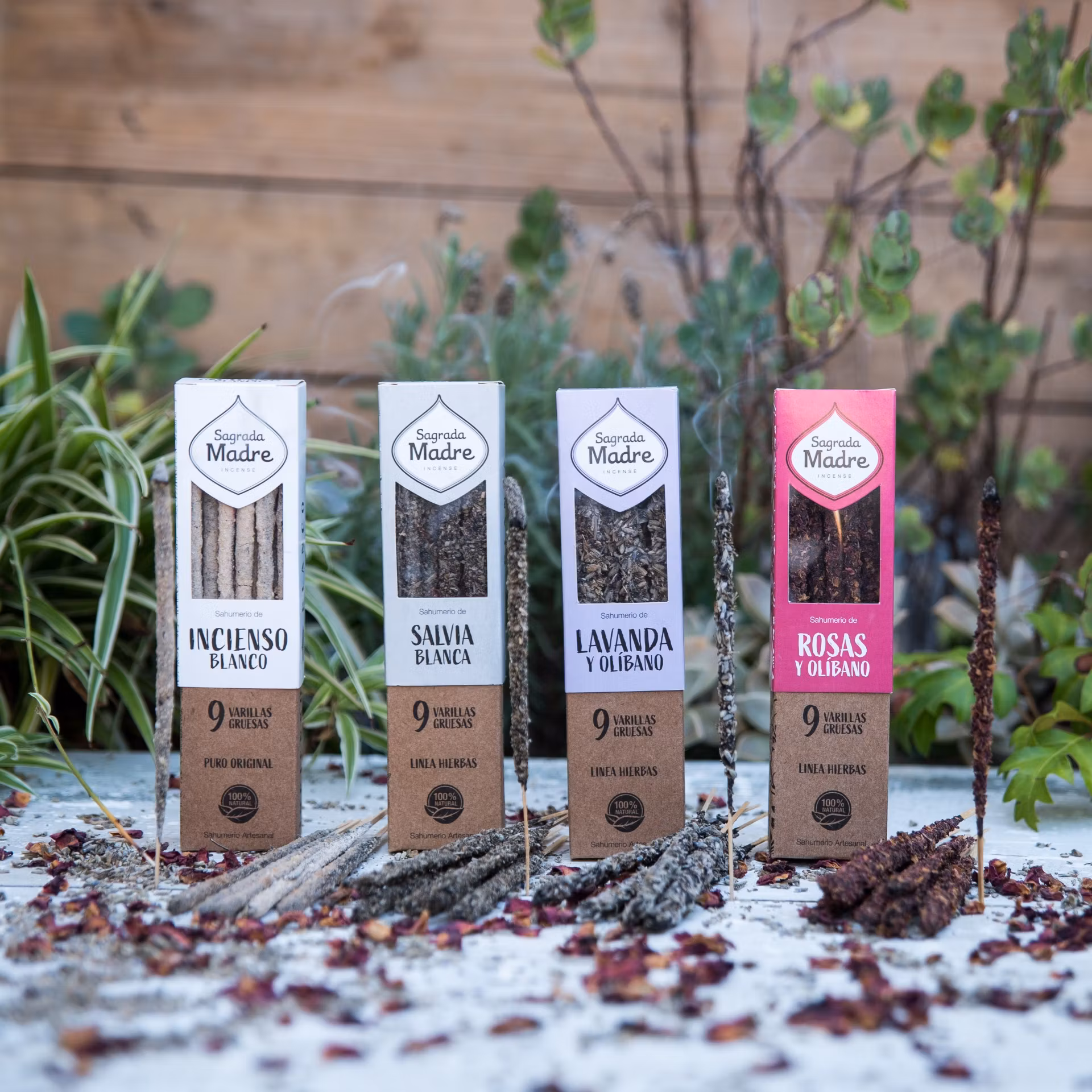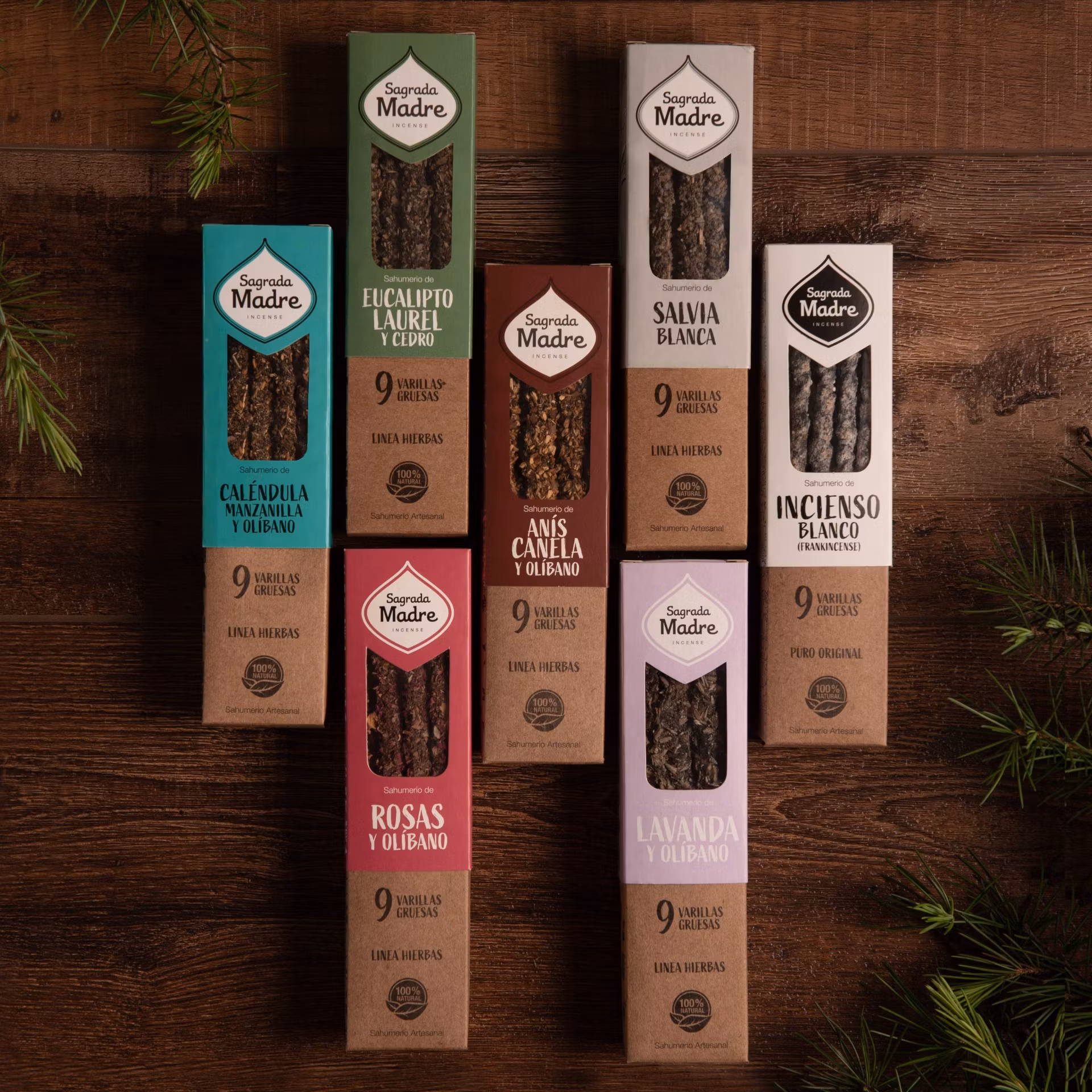 Märke: Sagrada Madre. Sagrada Madre betyder "Helig Moder" (Pancha Mama) och detta namn speglar hur de behandlar jordens resurser. Det är ett märke med väldoftande och högkvalitativa rökelser som tillverkas i Argentina. Förutom träkol använder Sagrada Madre en doftfri fruktbaserad biomassa som förbränningsmedel. Varje år slängs över 100 ton fruktbiomassa från industriell bearbetning såsom juicetillverkning. Istället för att låta dessa material gå till spillo, återanvänder Sagrada Madre dem effektivt i deras rökelser. En 100% unik naturprodukt, handgjord i Argentina av pulveriserade örter, hartser (kåda) och blommor, ihop med ett växtbaserat bindemedel. Alla varianter av Sagrada Madre rökelse är noggrant förpackade i attraktivt naturligt förpackningsmaterial för att skapa så liten påverkan på miljön som möjligt.