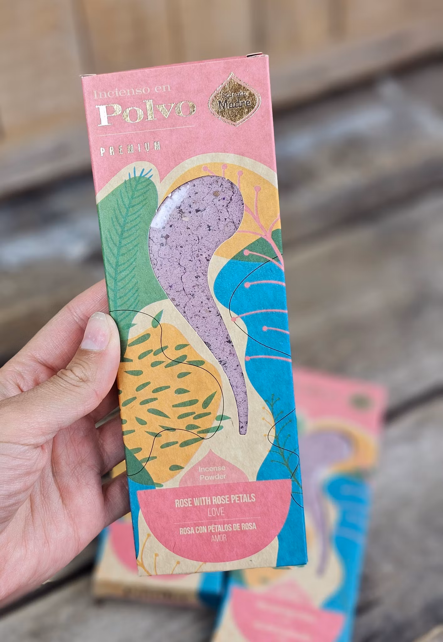 Märke: Sagrada Madre. Sagrada Madre betyder "Helig Moder" (Pancha Mama) och detta namn speglar hur de behandlar jordens resurser. Det är ett märke med väldoftande och högkvalitativa rökelser som tillverkas i Argentina. Förutom träkol använder Sagrada Madre en doftfri fruktbaserad biomassa som förbränningsmedel. Varje år slängs över 100 ton fruktbiomassa från industriell bearbetning såsom juicetillverkning. Istället för att låta dessa material gå till spillo, återanvänder Sagrada Madre dem effektivt i deras rökelser. En 100% unik naturprodukt, handgjord i Argentina av pulveriserade örter, hartser (kåda) och blommor, ihop med ett växtbaserat bindemedel. Alla varianter av Sagrada Madre rökelse är noggrant förpackade i attraktivt naturligt förpackningsmaterial för att skapa så liten påverkan på miljön som möjligt.