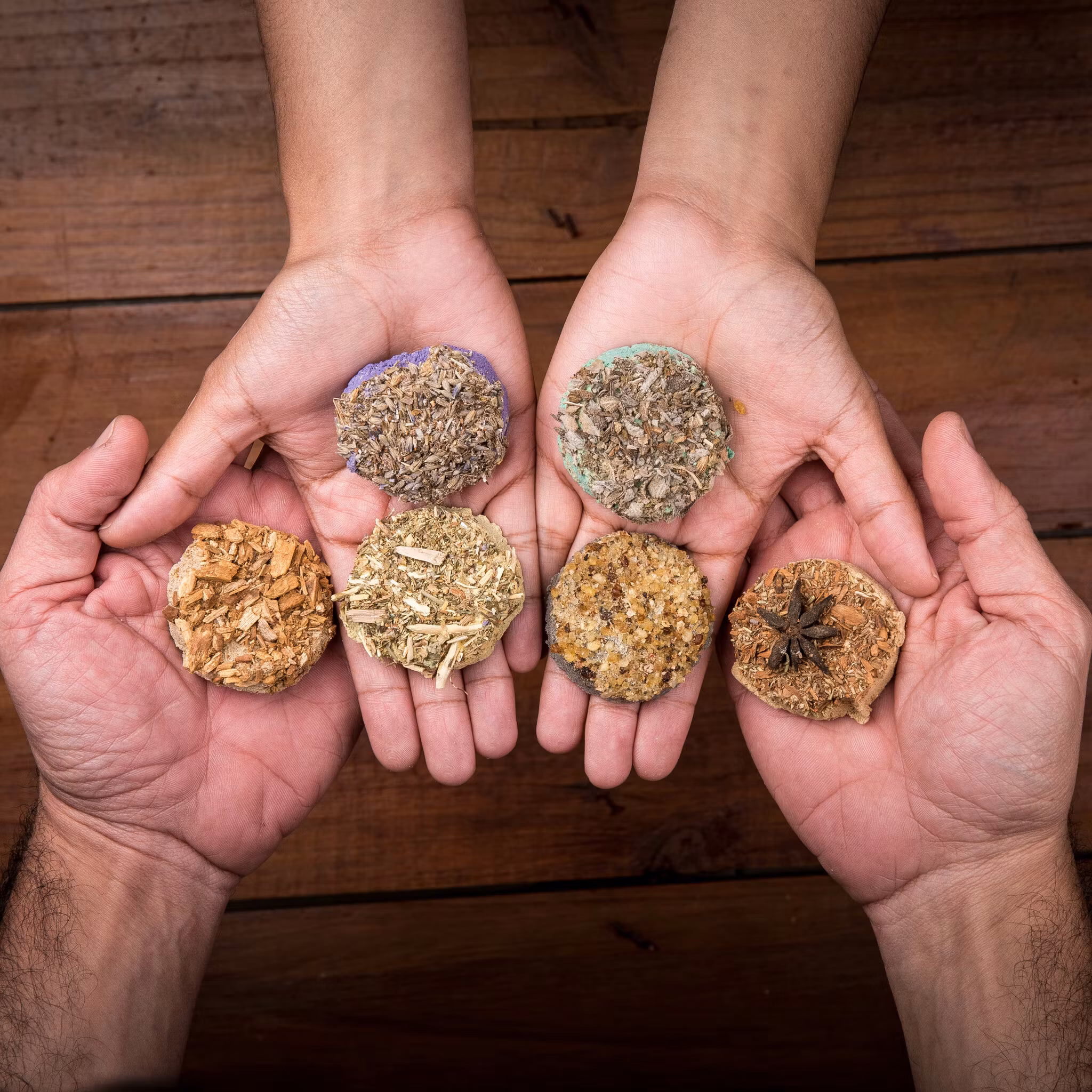 Doft: Vit Salvia. Fräsch, örtig och kryddig doft. Vit Salvia, förfädernass beskyddare, moder till villkorslös kärlek, ledare av ljus och positiv energi, strålande sköld, den heliga örten. Lyser upp atmosfären där den används och lämnar toner av kärlek och harmoni. Upphöjer själen till ett rent medvetande om personlig och materiell evolution och transcendens. Ingredienser örter, hartser, fruktbiomassa, träkol, naturligt bindemedel och salt. 100% vegansk, ekologisk.
