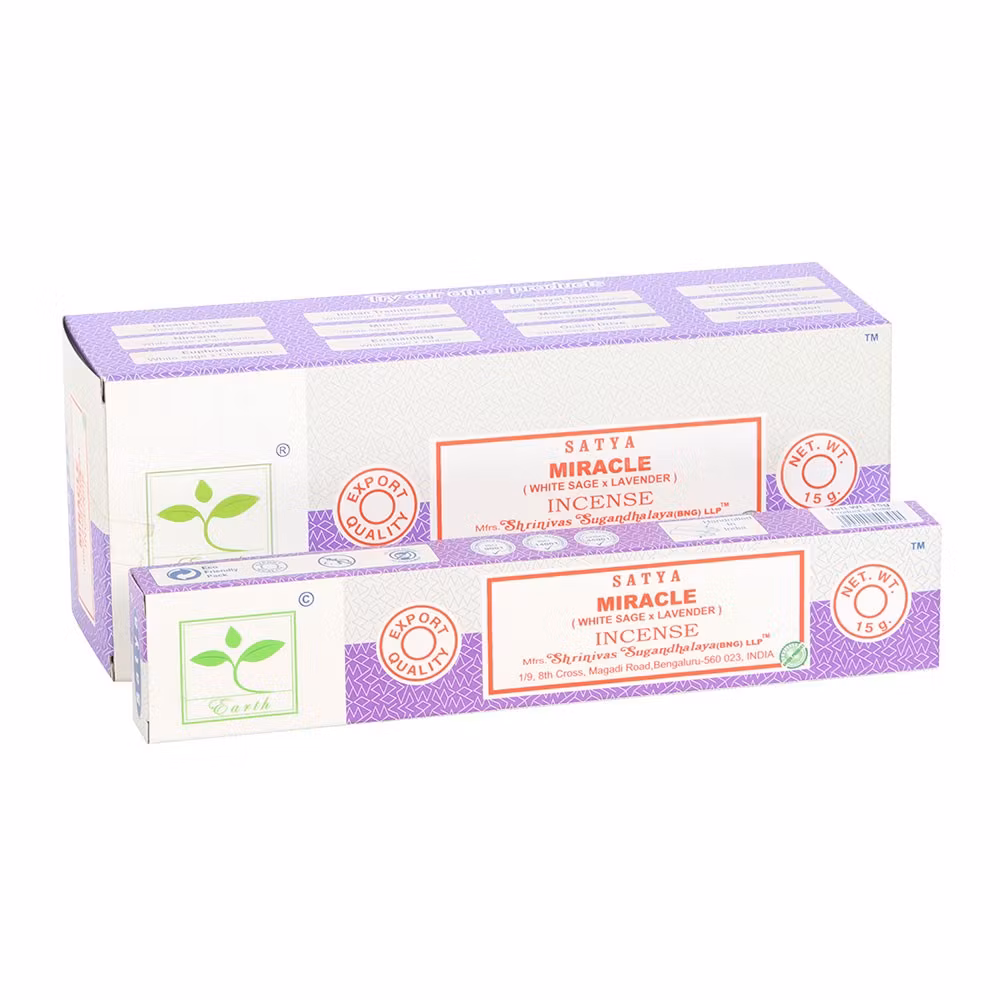 Doft: Miracle. En mystisk och inspirerande doft. Med sin upplyftande och harmoniska doft är denna rökelse perfekt för andliga övningar eller för att sätta specifika avsikter vid manifestation. Vegansk och cruelty free. Satya rökelse är handgjord av hantverkare i Indien med ingredienser av högsta kvalitet.