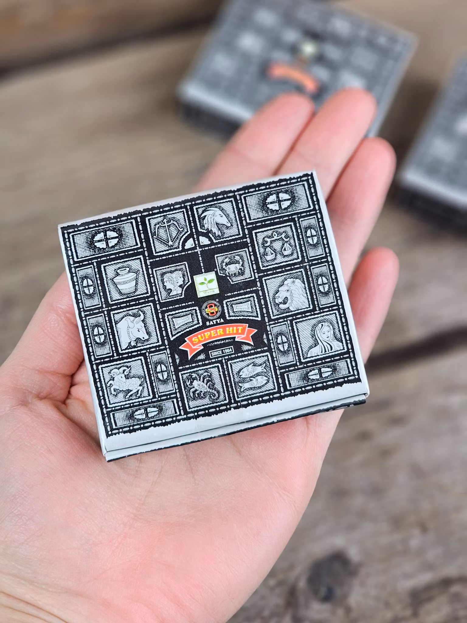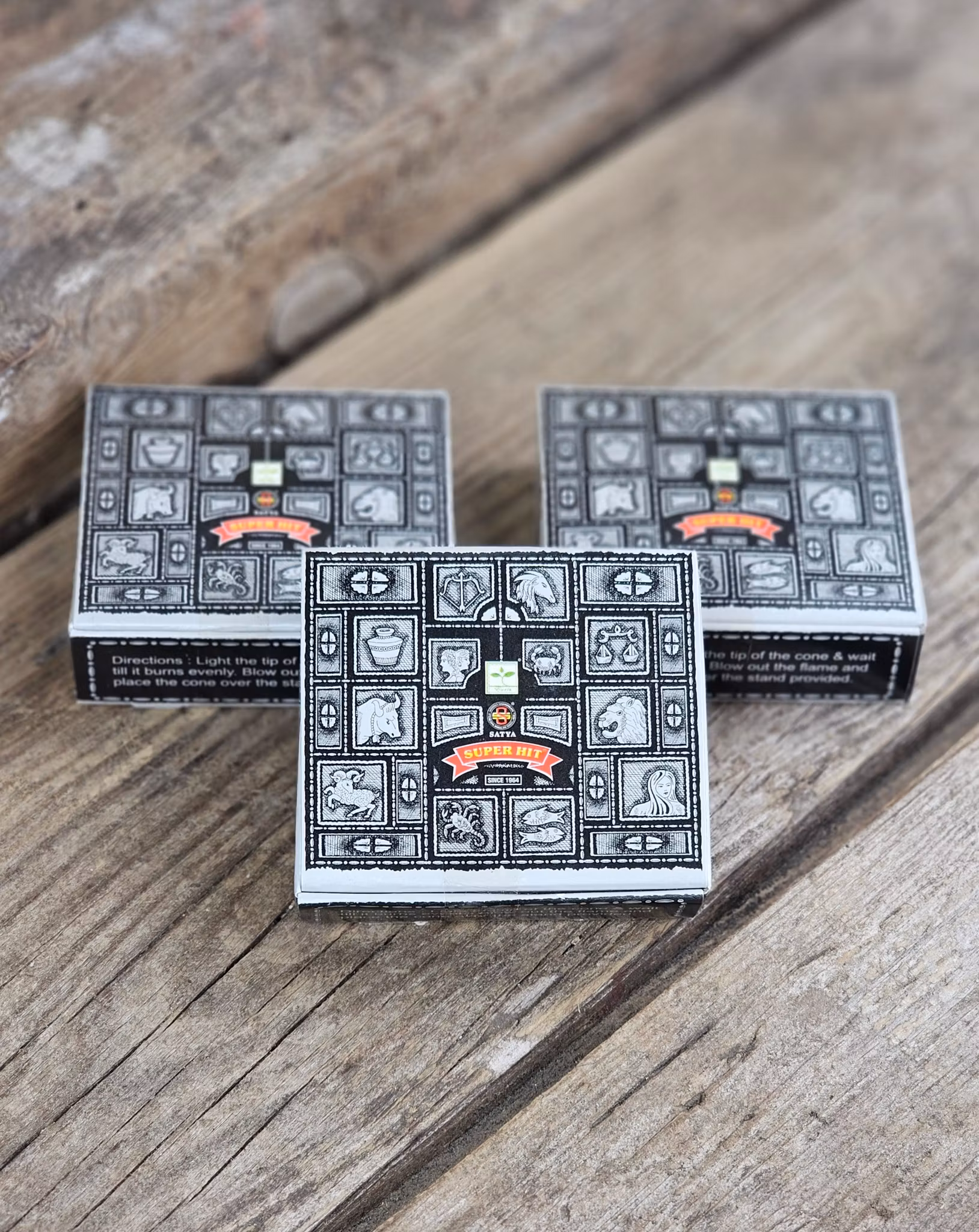 Doft: Super Hit. Rik, jordnära, söt, kryddig. Doftande blommor, indiska kryddor, örter och eteriska oljor ger denna rökelse en avslappnande doft som är likt sitt namn en storsäljare världen över. Super Hit skall hjälpa dig att minska de negativa tankarna och öka positiviteten omkring dig. Jättefin till både vardags i hemmet och till yogaövningar eller meditation.