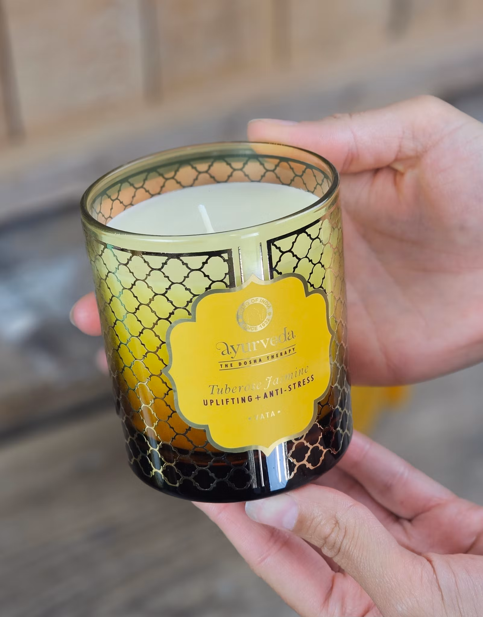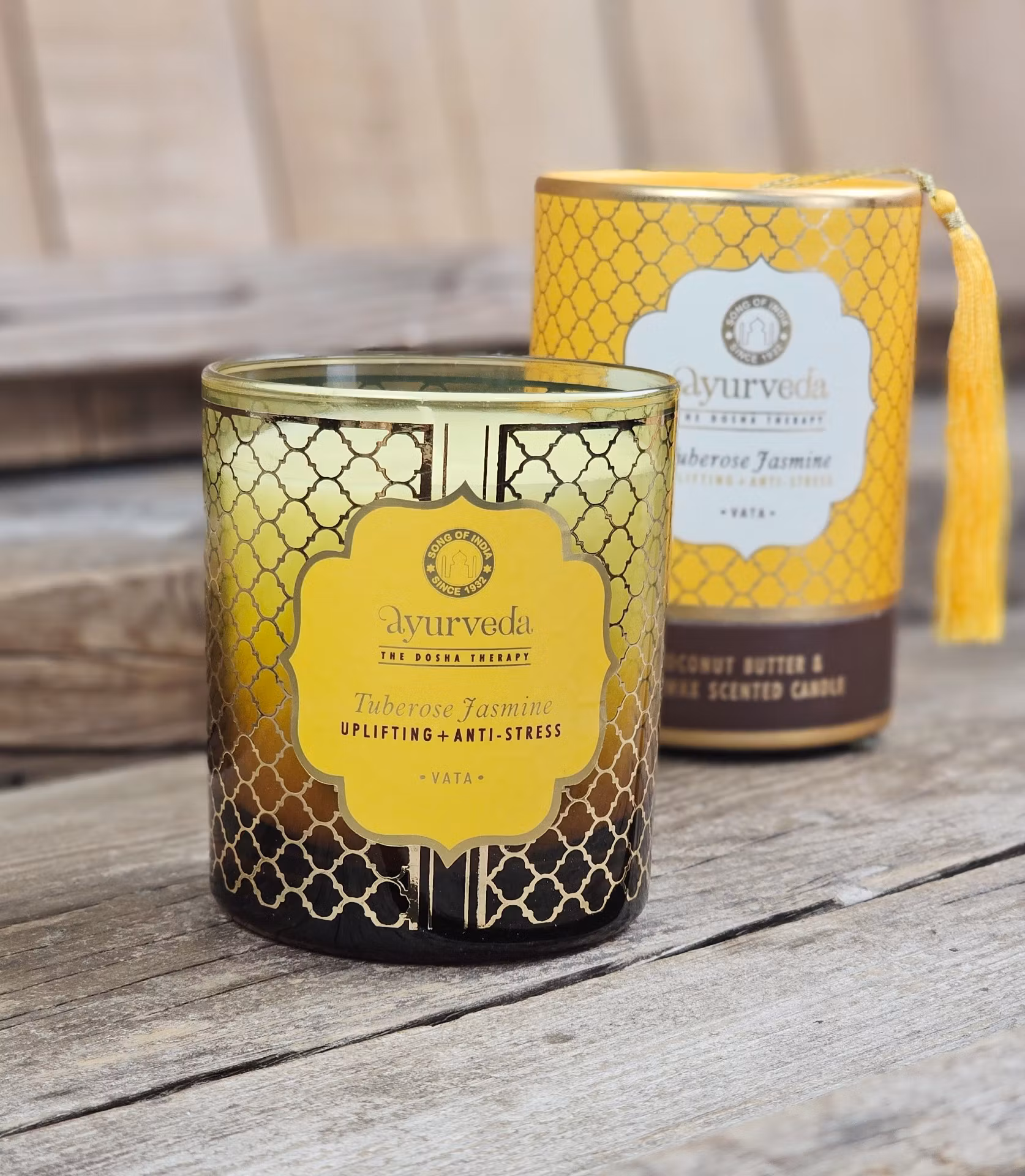 Doft: Vata Tuberose Jasmine. (Natthyacint & Jasmin) Ett Ayurvediskt doftljus tillverkat av lyxigt kokossmör och sojavax, tillverkat med de finaste eteriska oljorna. Handhälld med bomullsveke. Noter av färska indiska jasminblommor fantastiskt kombinerat med vita blommor av Natthyacint för att bilda en upplyftande och avstressande doft. Denna doft piggar upp dina sinnen och lägger till en välkomnande känsla i atmosfären. Passar perfekt med vata dosha. Innehåller ej kemiska tillsatser eller artificiella doftämnen.