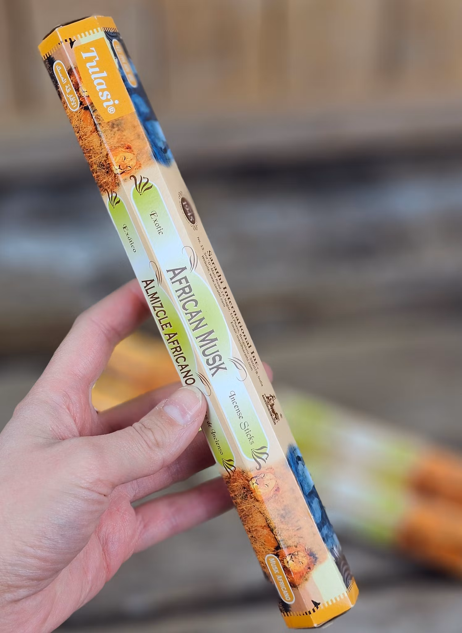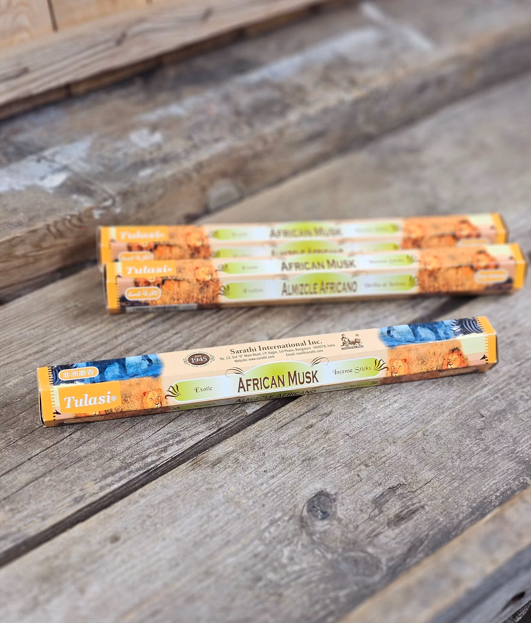 Doft: African Musk. Sensuell, träig, kryddig doft. Utvinns från muskblomman. Det är en mycket vanlig ingrediens vid parfymtillverkning. Denna rökelse är känd för att framkalla kärlek och romantik, ge mod och inre styrka.
