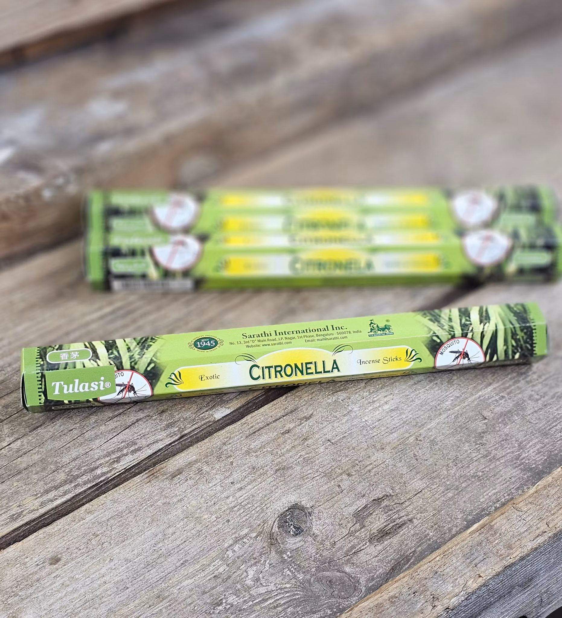 Doft: Citronella. Mycket fräsch citrusdoft. Citronella anropar livets krafter för läkning, avkoppling och lycka för den som använder sig av denna rökelse. Sägs även passa perfekt till sommarkvällarna för att hålla myggen borta.