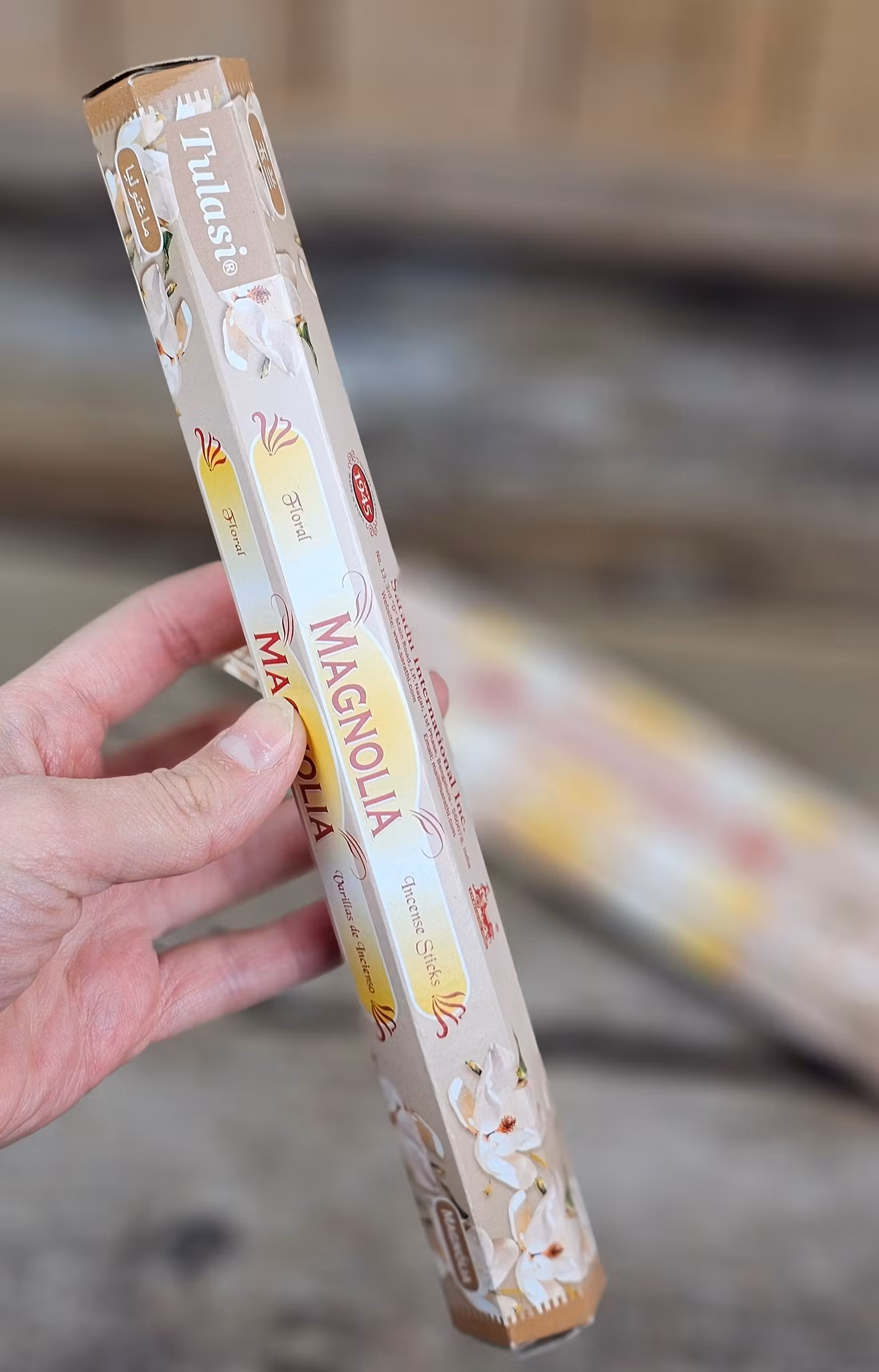 Doft: Magnolia. Den ljuvliga, blommiga aromen av Tulasi's Magnolia rökelsestickor är idealisk för att skapa en atmosfär av fridfull avkoppling i ditt hem.