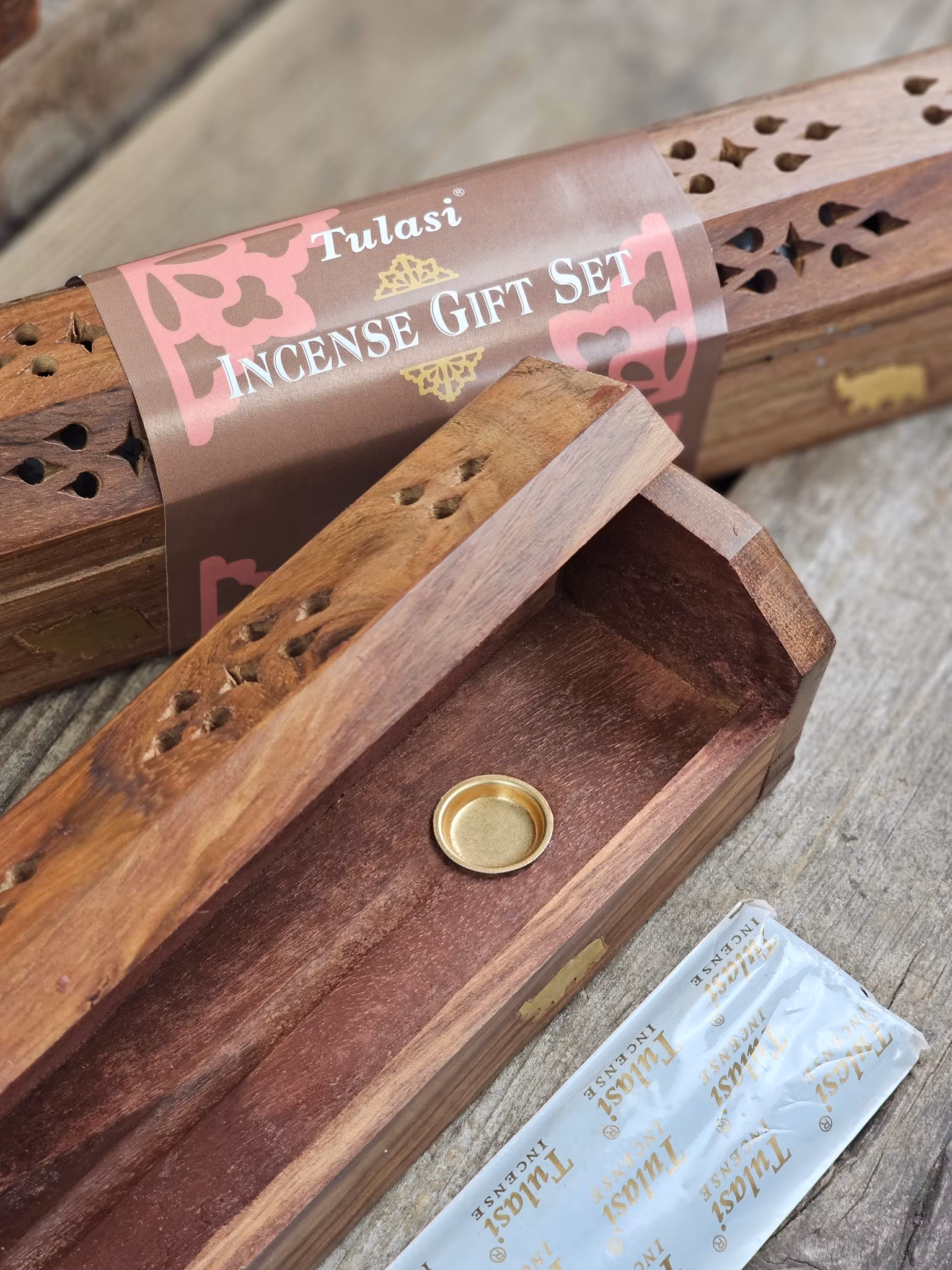Säljes per 1 styck trälåda med plats för att bränna rökelser i inklusive ett paket med 20 stycken rökelsepinnar från Tulasi.