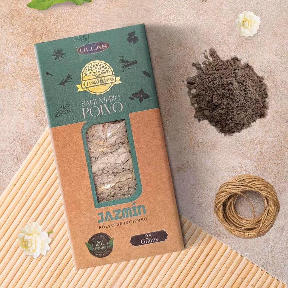 Doft: Jasmine (Jasmin). Blommig och söt doft. Varva ner i en symfoni av lugn. Detta rökelsepulver (Sahumerio Polvo) är en naturprodukt gjord av torkade och krossade jasminblommor. Dess blommiga och sensuella arom kommer att transportera dig till en jasminträdgård i Indien och fylla din omgivning med romantik, sensualitet och positivitet. Insvept i den delikata omfamningen av ekologisk Jasmin erbjuder dessa hantverksmässiga skapelser en doftande flykt till lugnet. Låt den varma, blommiga essensen smälta bort spänningar när du fördjupar dig i ett tillstånd av djup avslappning. Ullas Agarbathies är tillverkade för att vara miljövänliga och giftfria och säkerställer förstklassig brinnkvalitet. Ullas Organico-serie är världens första rökelse som tilldelats certifieringen ECOCERT Greenlife för sina rena och vegetabiliska rökelser.