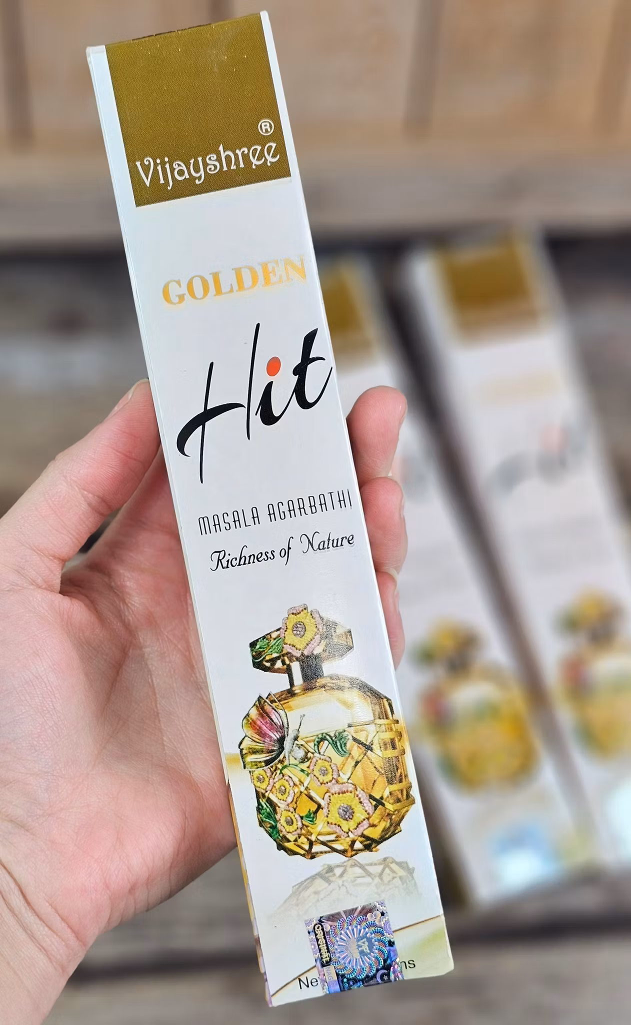 Doft: Golden Hit. Golden Hit är det sanna traditionella receptet på den mest populära indiska rökelsen som avnjuts runt om i världen. Vijayshree rökelse är en unik blandning av sällsynta örter, blommor, hartser och eteriska oljor.