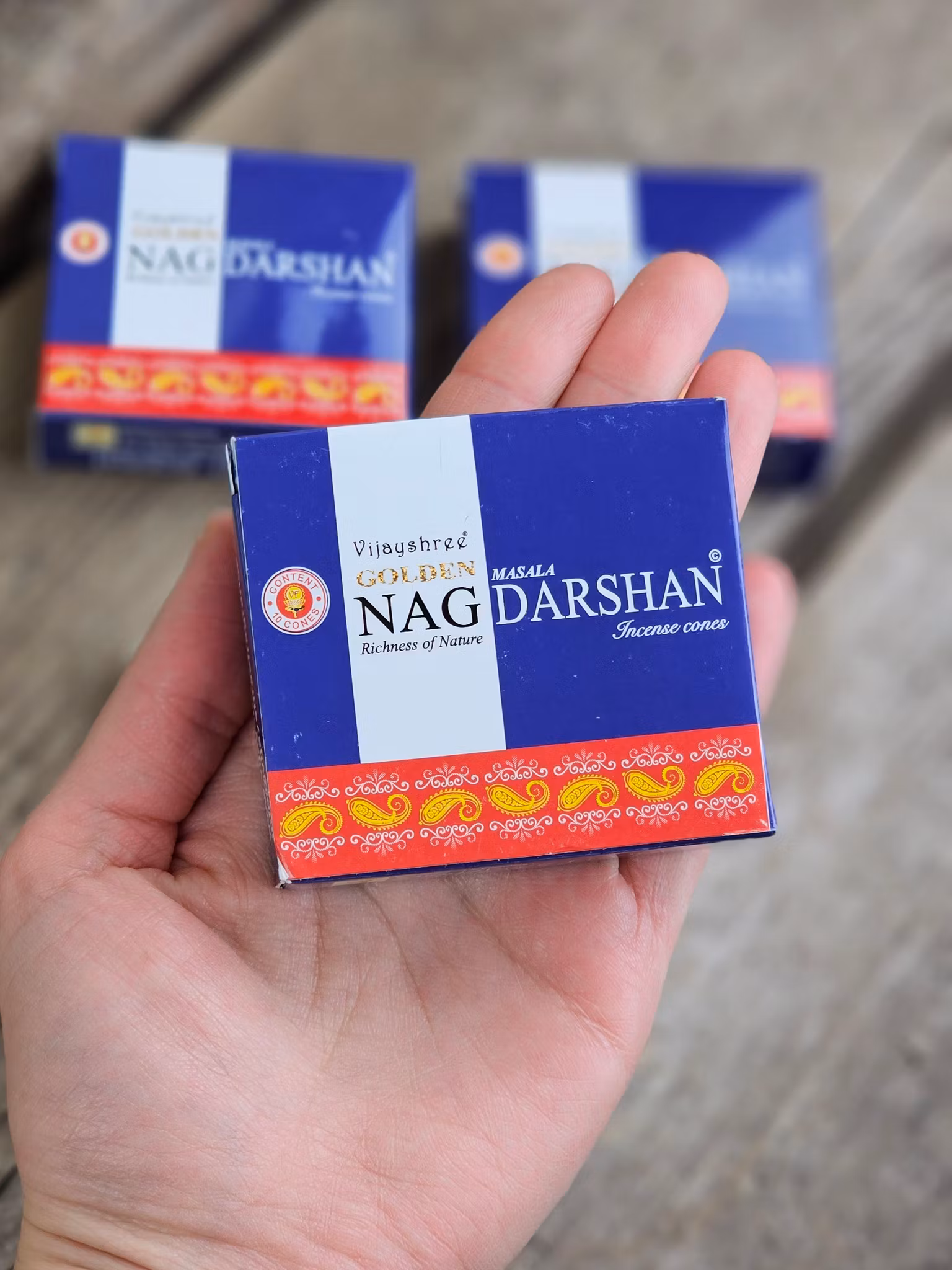 Doft: Golden Nag Darshan. En rik, söt och kryddig behaglig doft som ger upplevelsen av en gudomlig närvaro. Darsana (Darshan, sanskrit: दर्शन) är en sanskritterm som betyder "syn" (i betydelsen av en instans av att se eller skåda; syn, uppenbarelse eller glimt. Det används oftast för "visioner av det gudomliga", t.ex. av en gud eller en mycket helig person eller artefakt.
