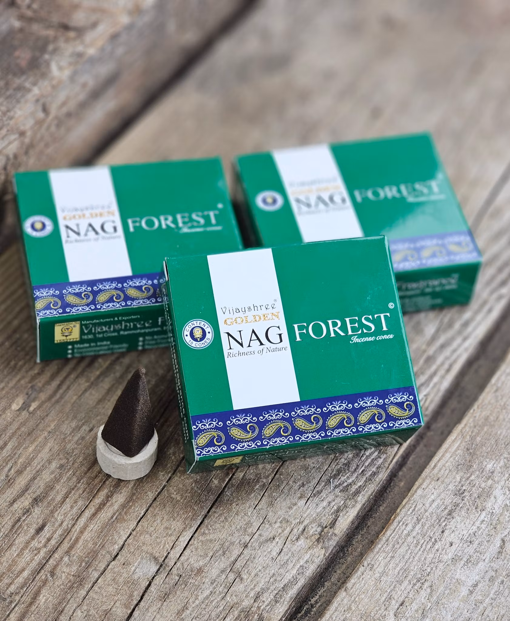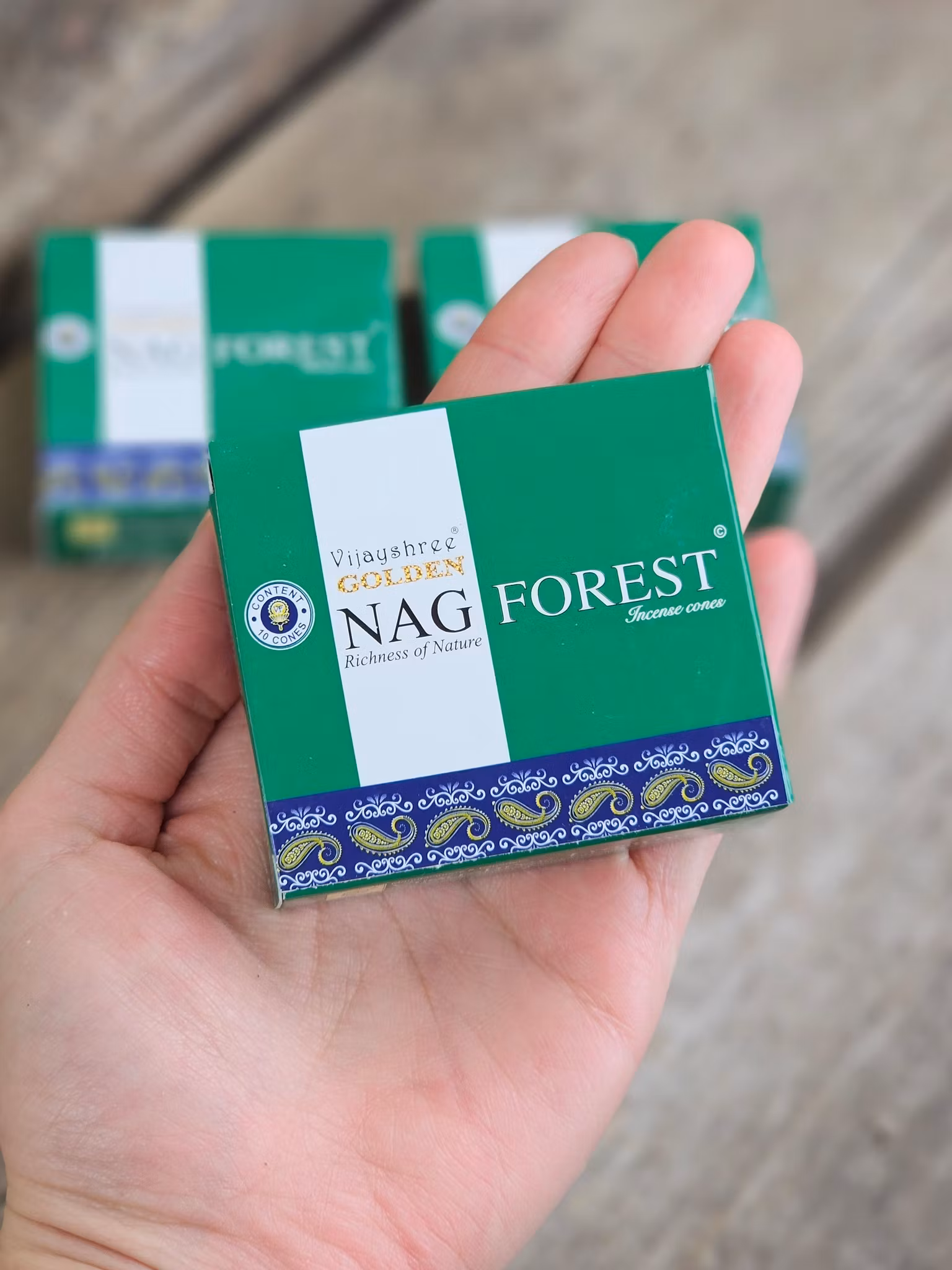 Doft: Golden Nag Forest. Grunden för denna rökelse är plumeriablomman (mer känd som Nag Champa), samt kryddblandning med bland annat kryddnejlika. En kombination med sötma och kryddor. Golden Nag Forrest är en underbar doft, som hjälper dig att koppla av. En fräsch och mjuk doft. Föreställ dig att du befinner dig i regnskogen när solens strålar når dig genom lövtaket efter en uppfriskande regnskur.